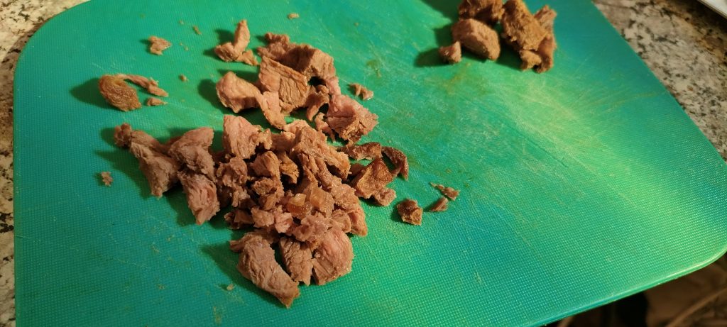Sie bekommt ein kleines Würfelchen Rind. Praktische Tiefkühlkost. 😀
