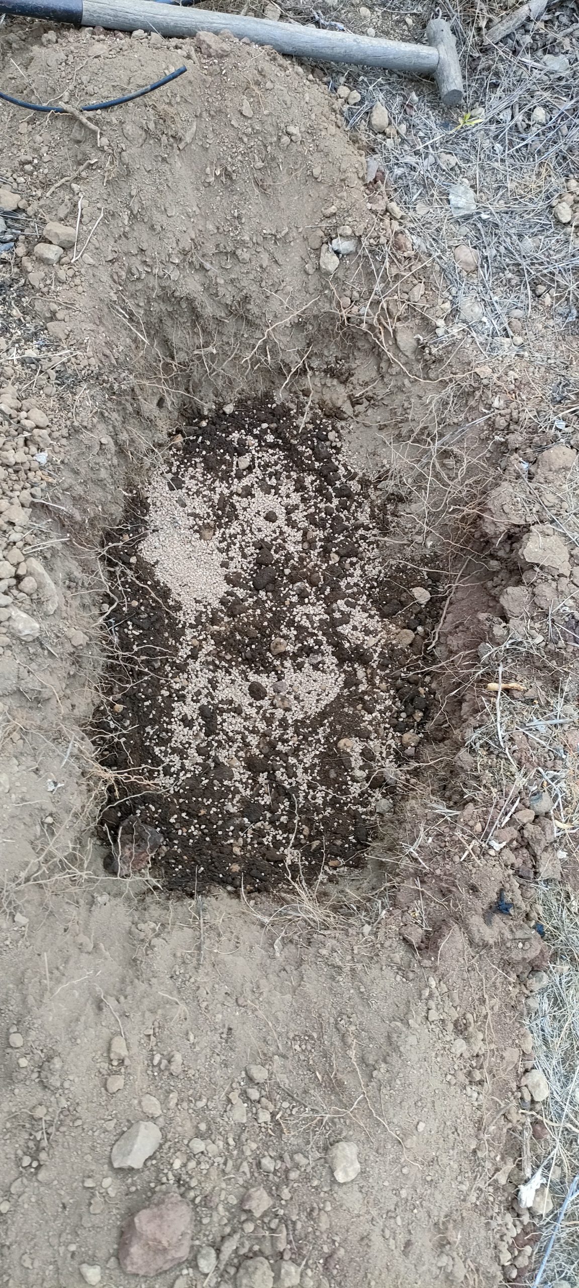 Erst mal ein tiefes Loch mit viel Kohle und Öko Granulat durch hacken.