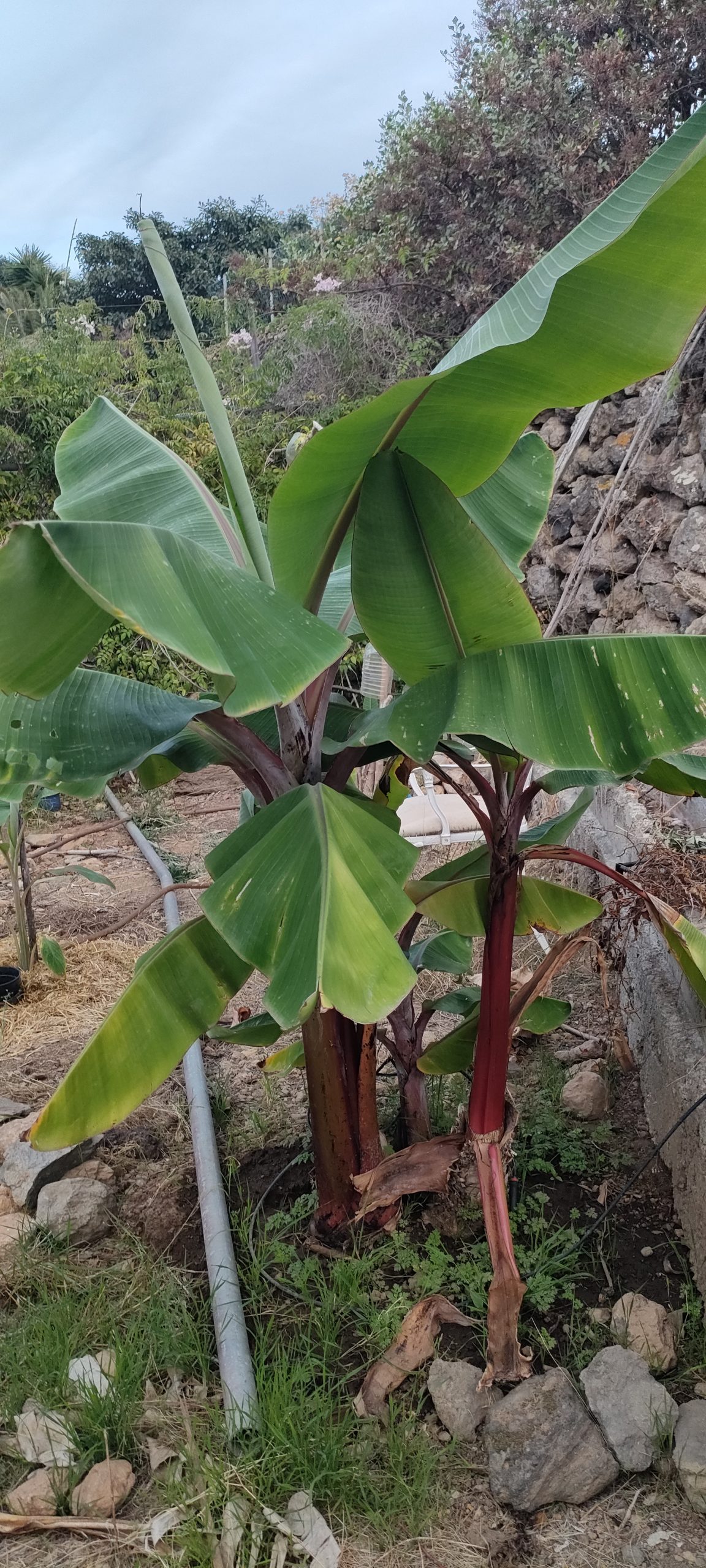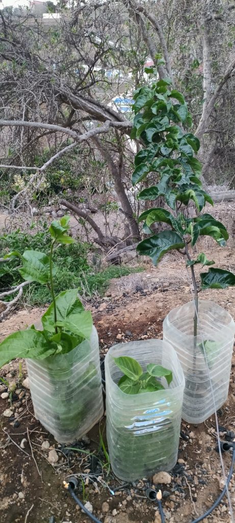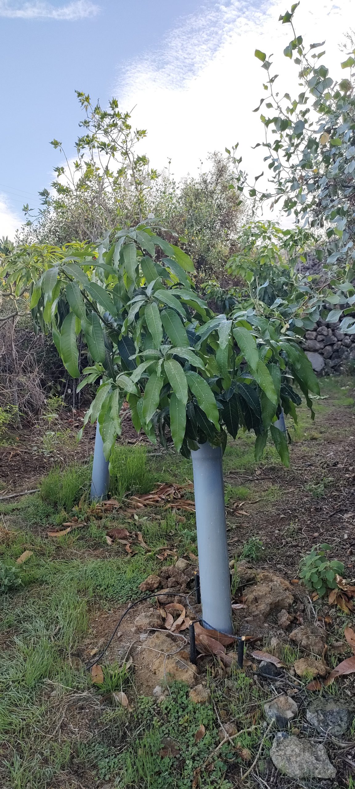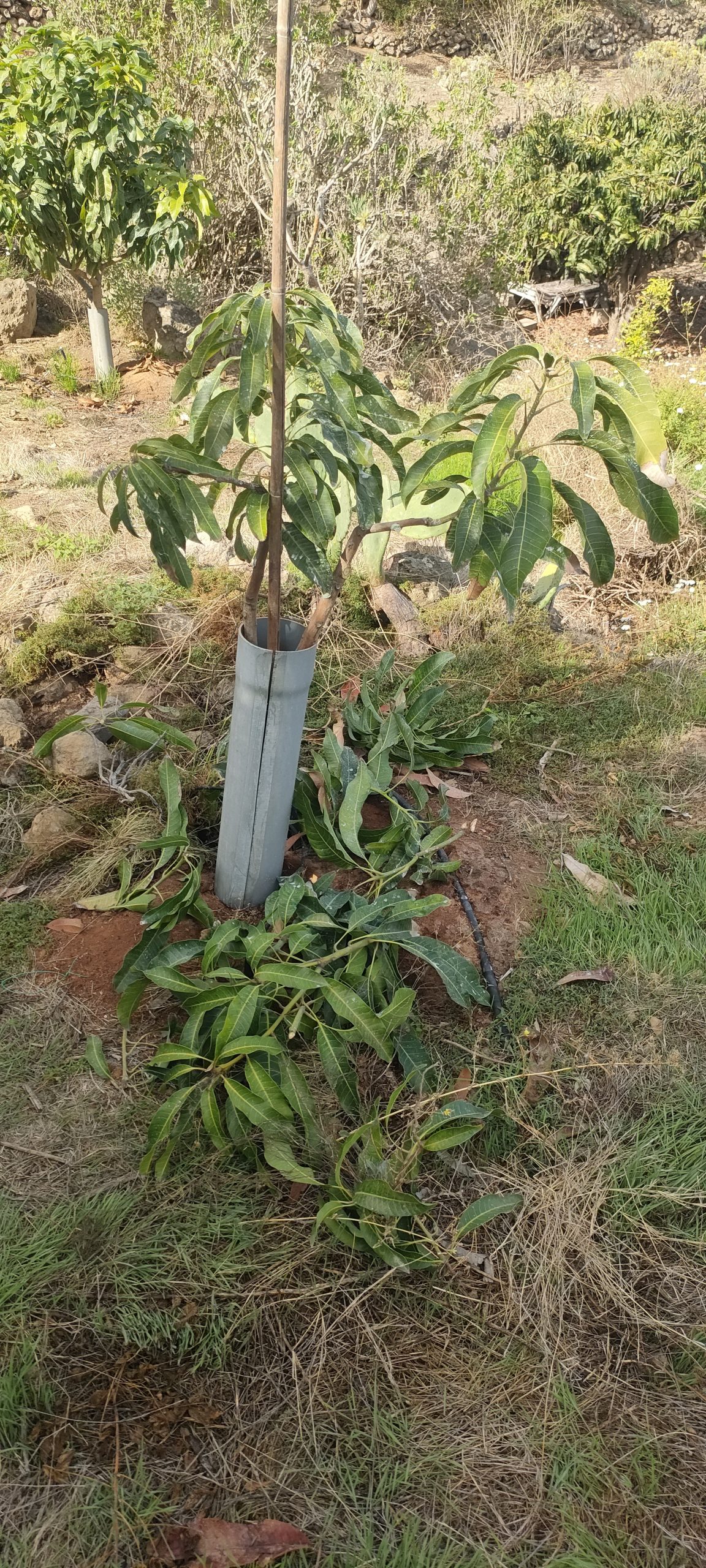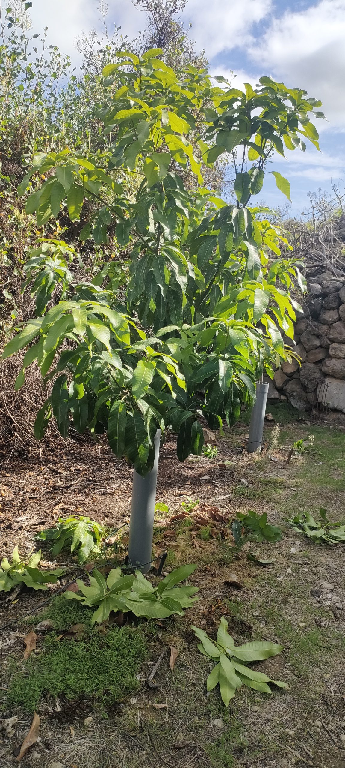 Das ist der zweite Manzanillo. Ohne Frucht hat er bereits drei Stämmchen ausgebildet, auf denen der nächste Schub quasi verdreifacht wachsen wird.