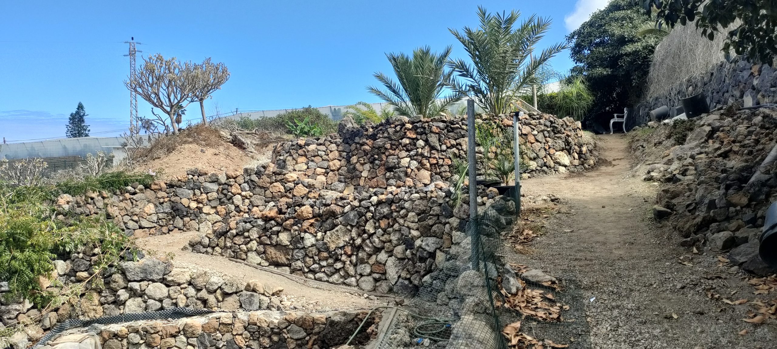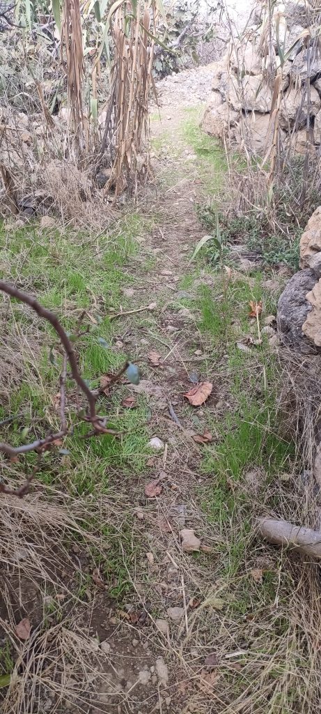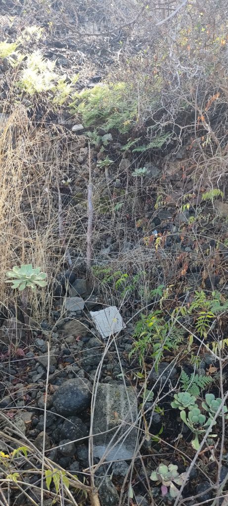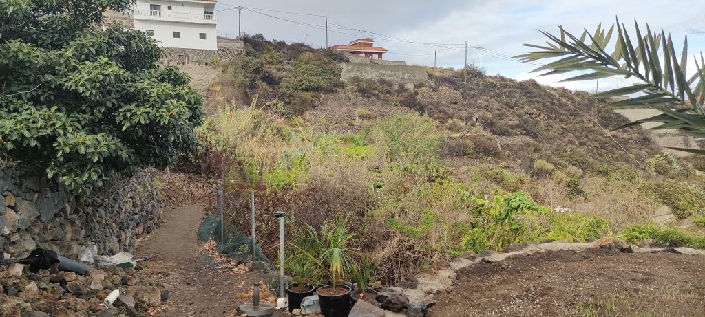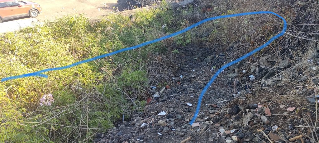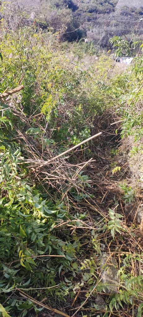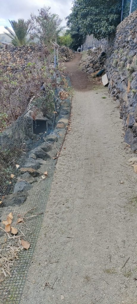 Immer wieder mal so ein Paket und nach weiteren 10m. Gestrüpp, komme ich auf einen schönen, begehbaren Abschnitt, der dann nach links, zum Pyramidenpfad führt. Dann gibt es einen Weg, der unter der Brücke ins Tal, unter die Pyramide und bis zur Arena geht. Das sind dann über 100 Meter und die Finca hat dann einen aufregenden Rundweg!