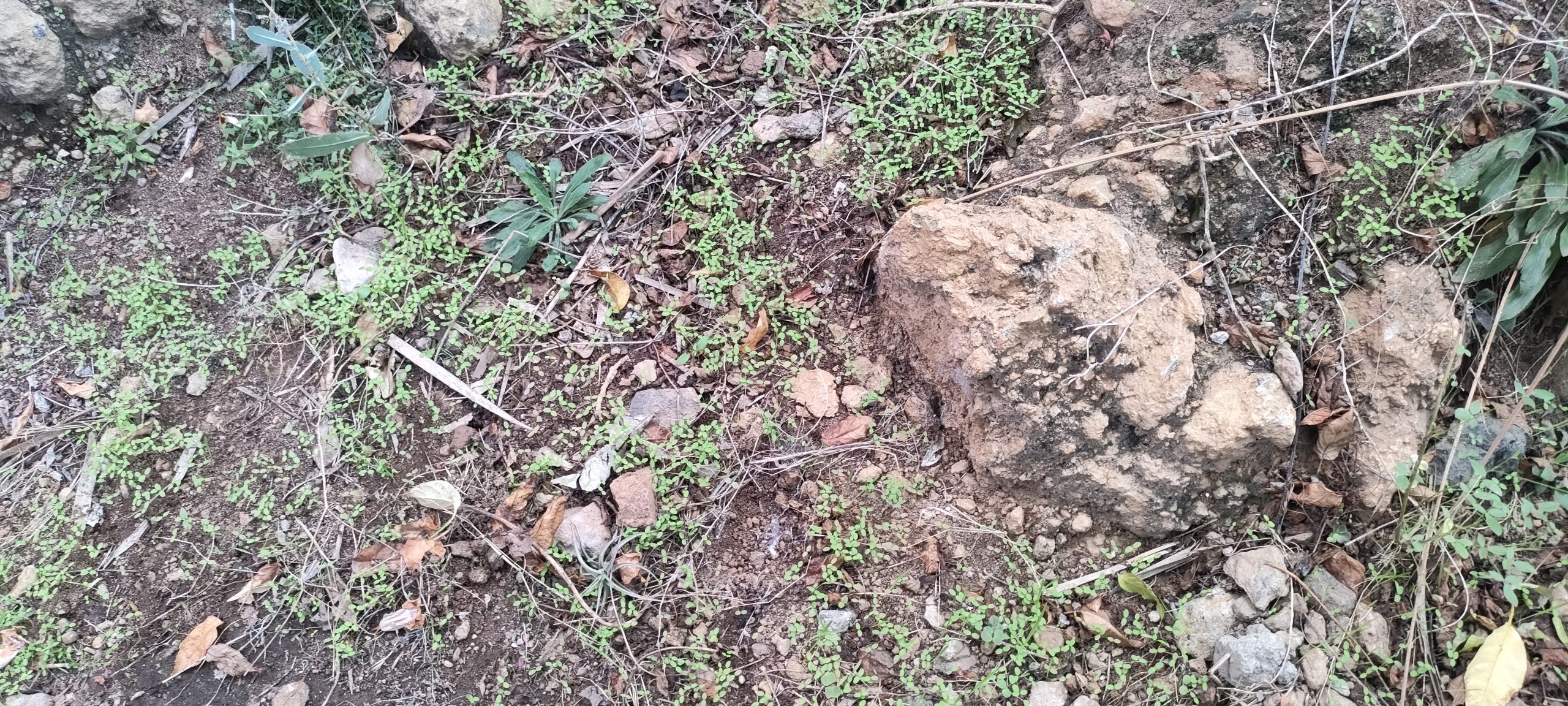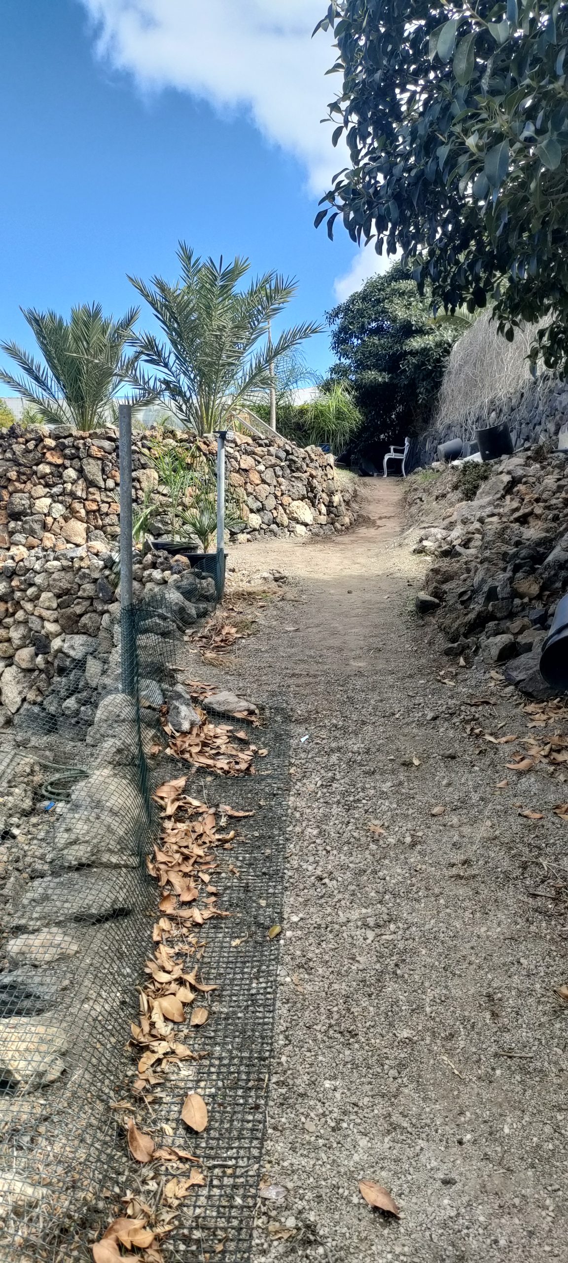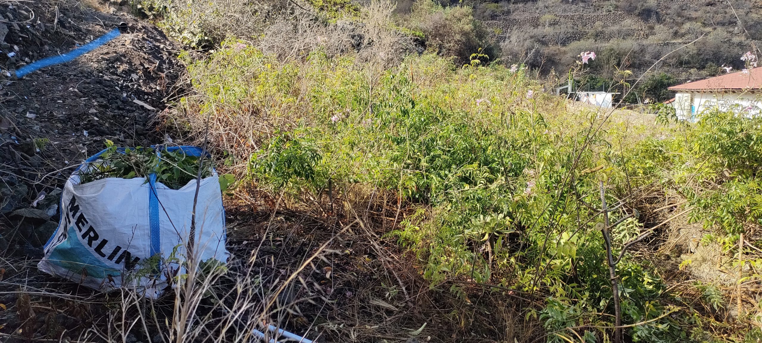 Immer wieder mal so ein Paket und nach weiteren 10m. Gestrüpp, komme ich auf einen schönen, begehbaren Abschnitt, der dann nach links, zum Pyramidenpfad führt. Dann gibt es einen Weg, der unter der Brücke ins Tal, unter die Pyramide und bis zur Arena geht. Das sind dann über 100 Meter und die Finca hat dann einen aufregenden Rundweg!