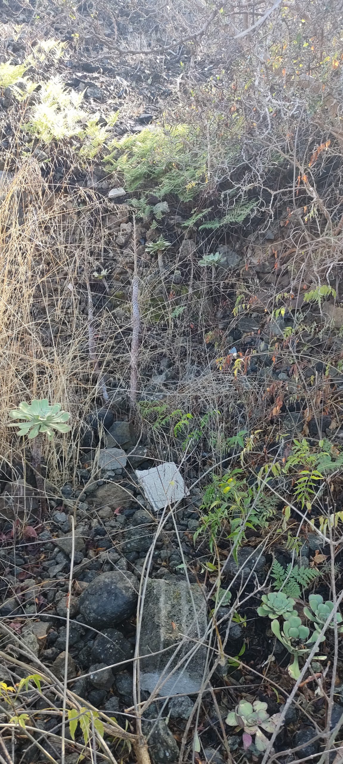 Das Ende von meinem Pfad am Schuttberg. Der Pfad wird rechts noch weiter aufgehäuft und in dem Gestrüpp schneide ich gleichzeitig eine Fortsetzung frei.