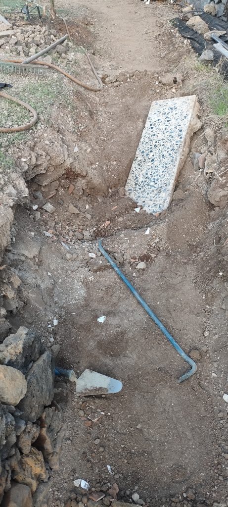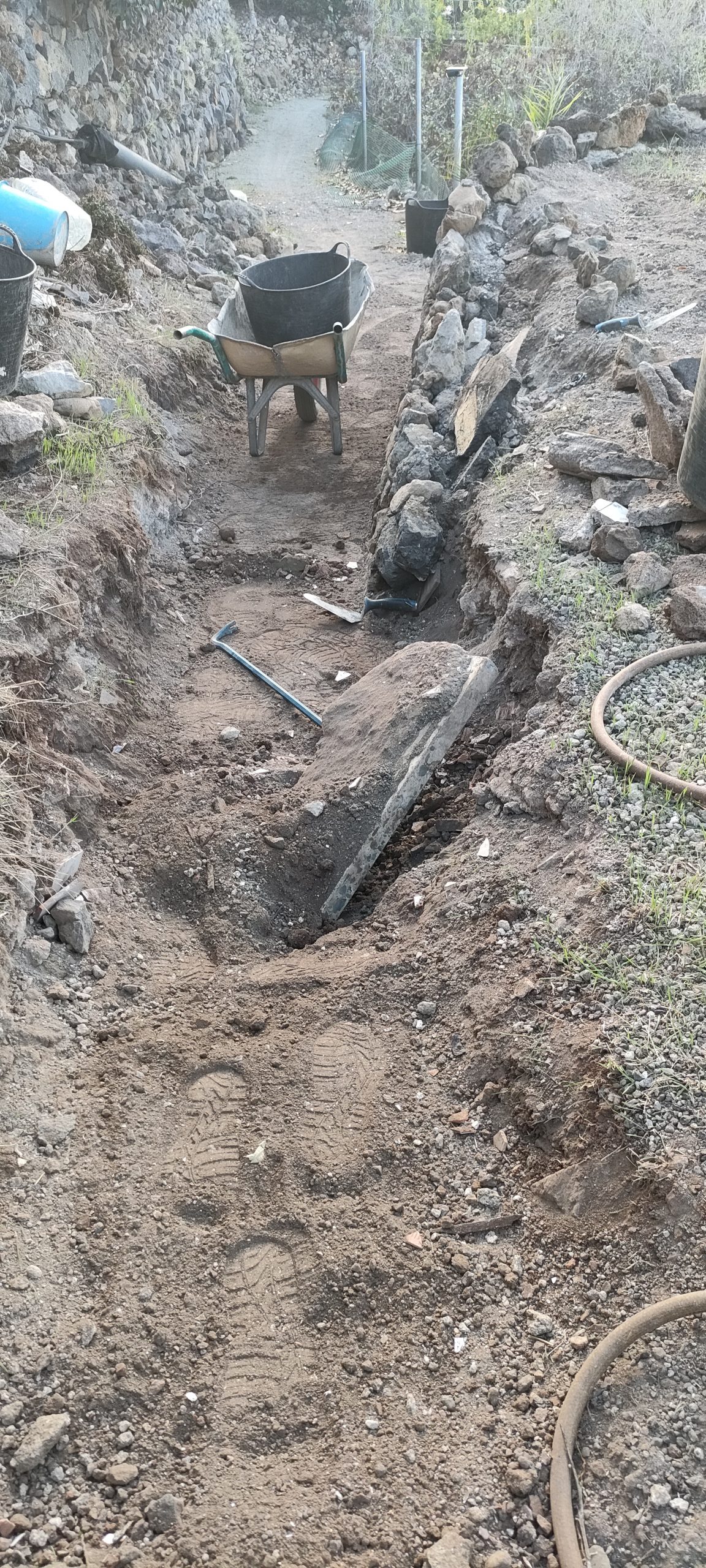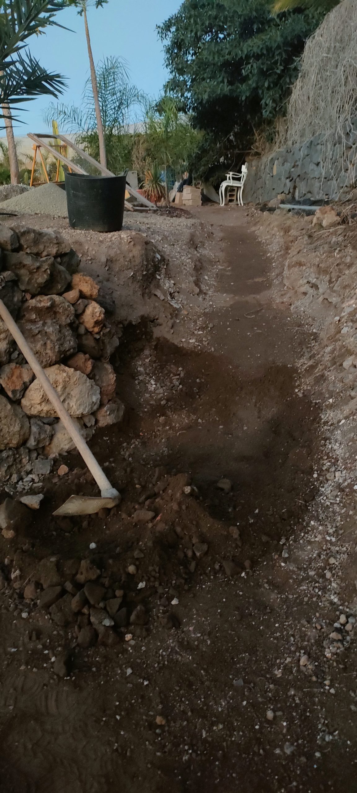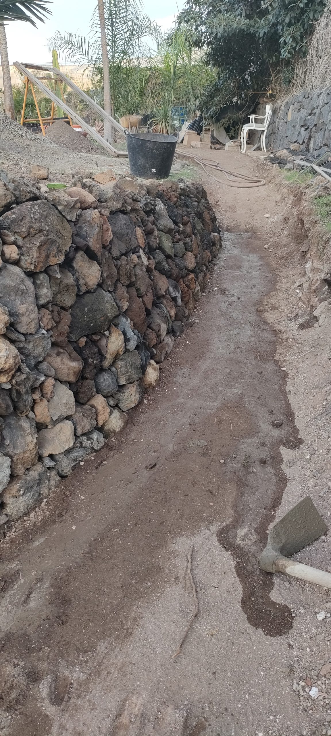 Dieser Stil liegt genau an dem Stein, bei dem der Weg vor kurzem noch geendet hat. Dort liegt er jetzt etwa 70cm tiefer und dort komme ich gerade mit den ersten Steinreihen an.