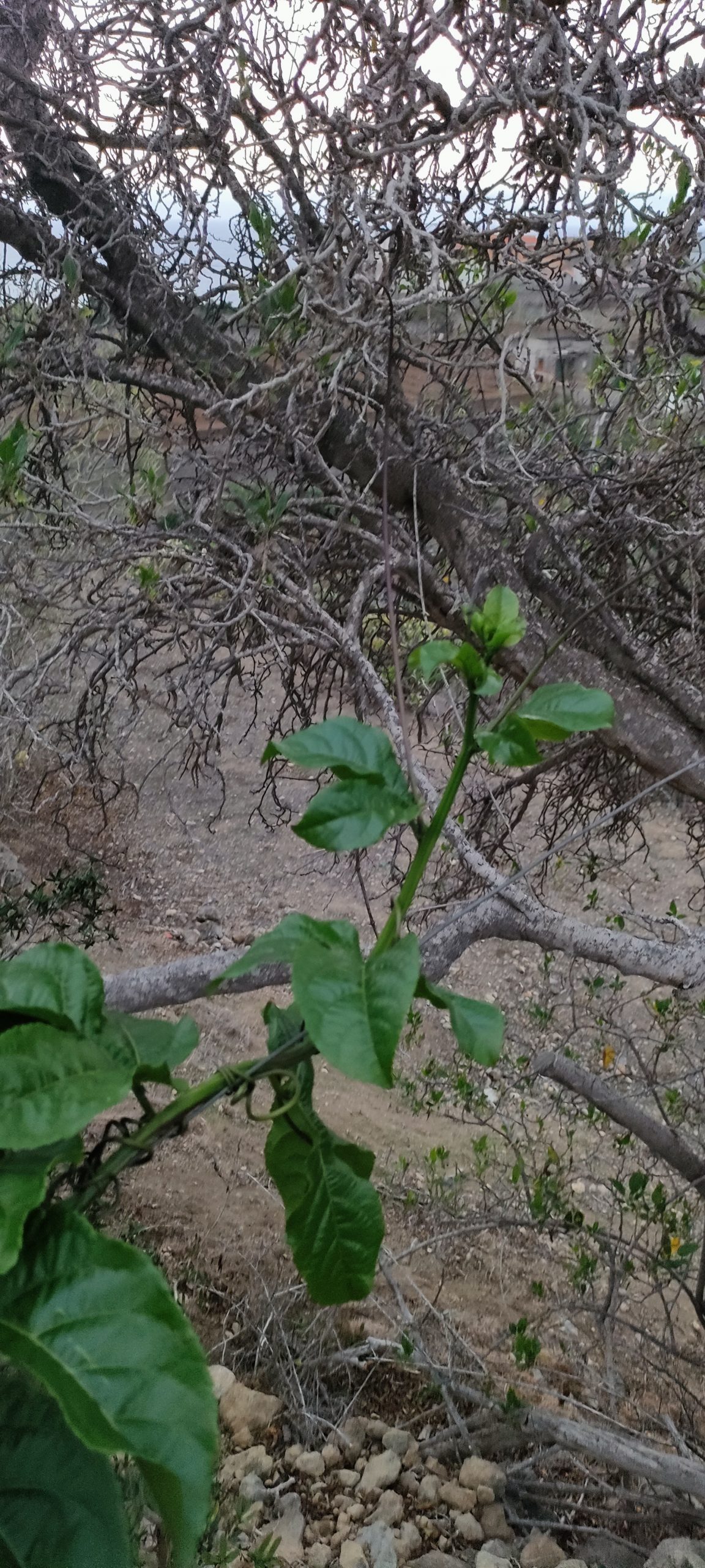 Erinnert ihr euch an die neuen Maracuja Pflanzen, die ich mit dem Draht in den alten Baum ziehe?