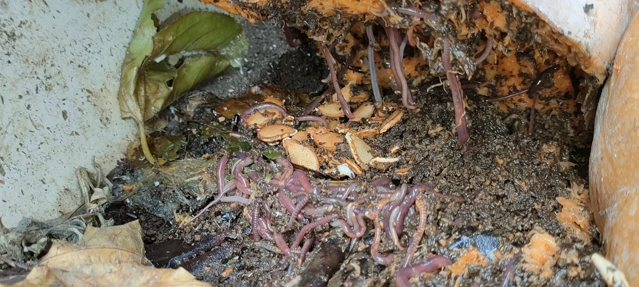 Gestern gab ich den Würmern einen angefressenen Kürbis. Heute ist er voll belagert und schon sichtbar angefressen! 😳