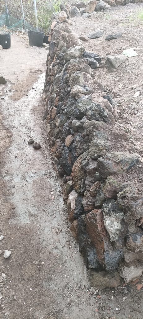 Letzte Nacht, legte ich ganz genüsslich, mit Stirnlampe, schöne Steine auf die obere Reihe. Da ist man am wenigsten gehetzt und der Abschluß soll liebevoll verspielt werden!