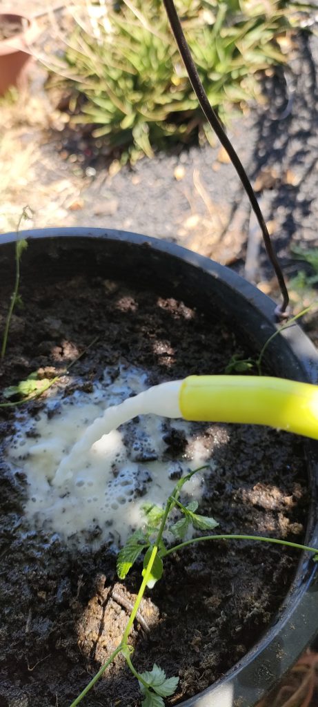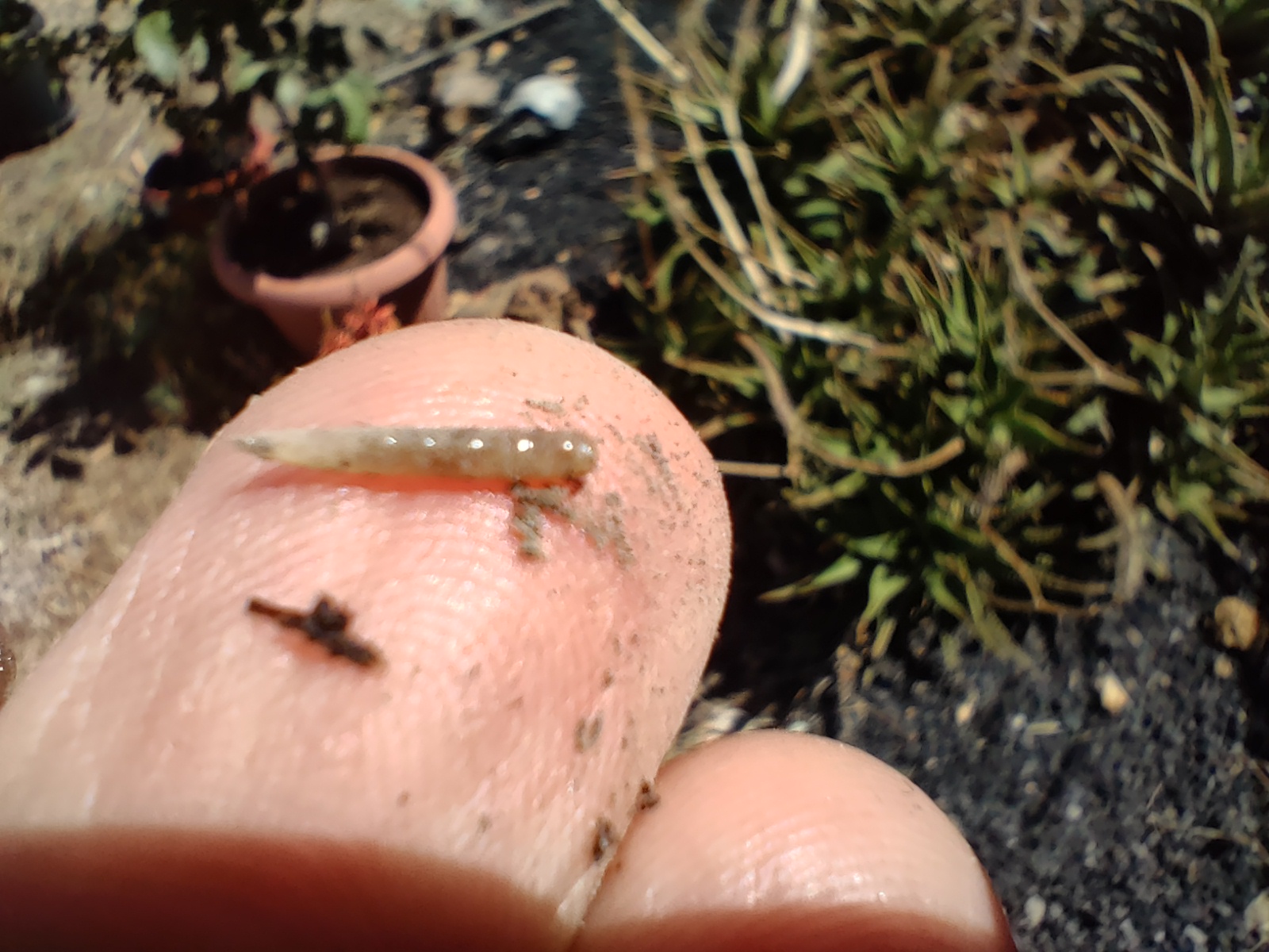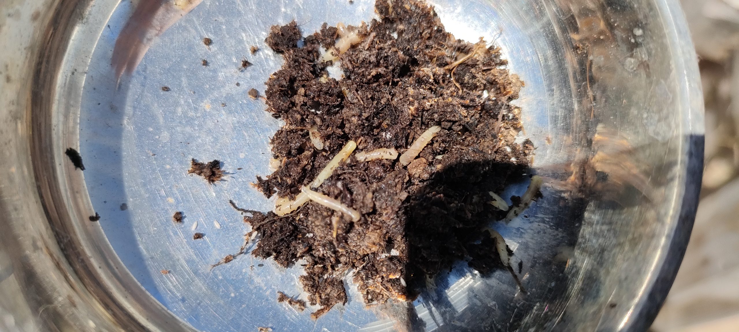 Wie bei Trauermücken Nemadoten, die man auch mit feinstem Sand fern halten kann, dosiere ich heute mal 15ml. Neemöl pro Liter. Das riecht schon nachhalig und hier kamen schon die ersten Maden aus der Erde: