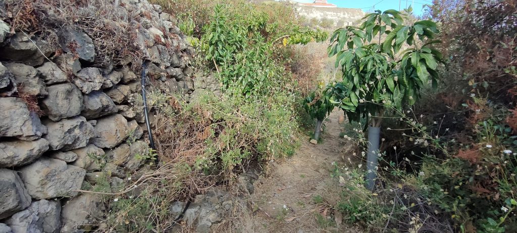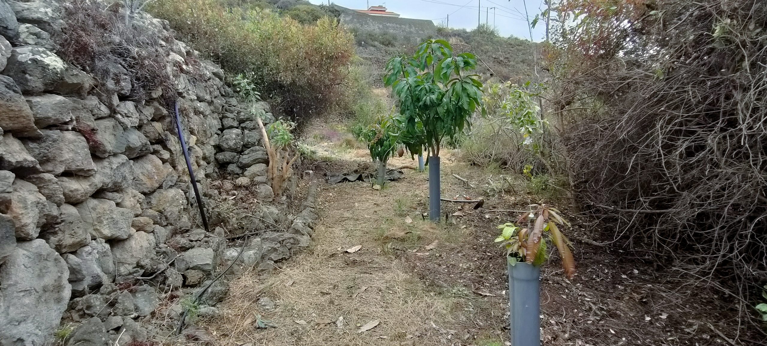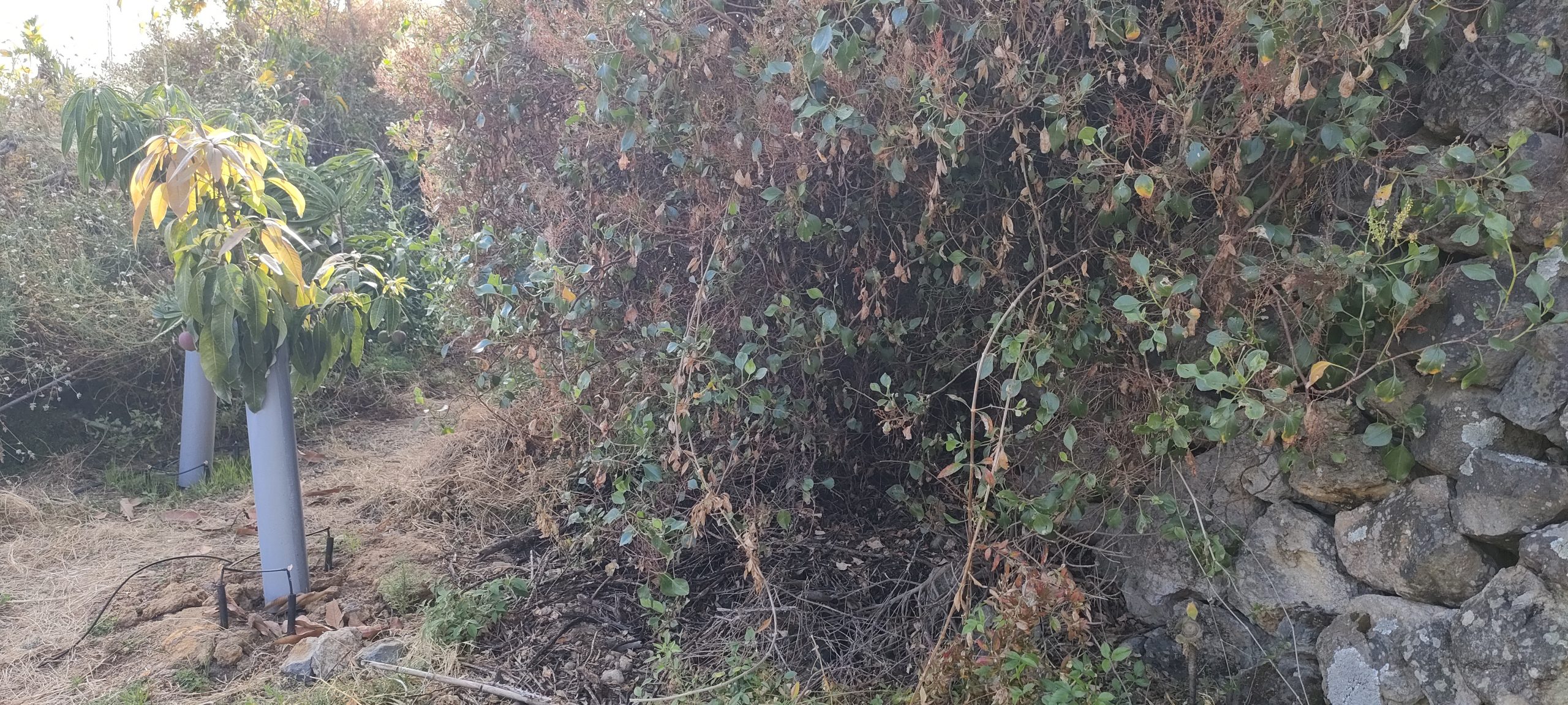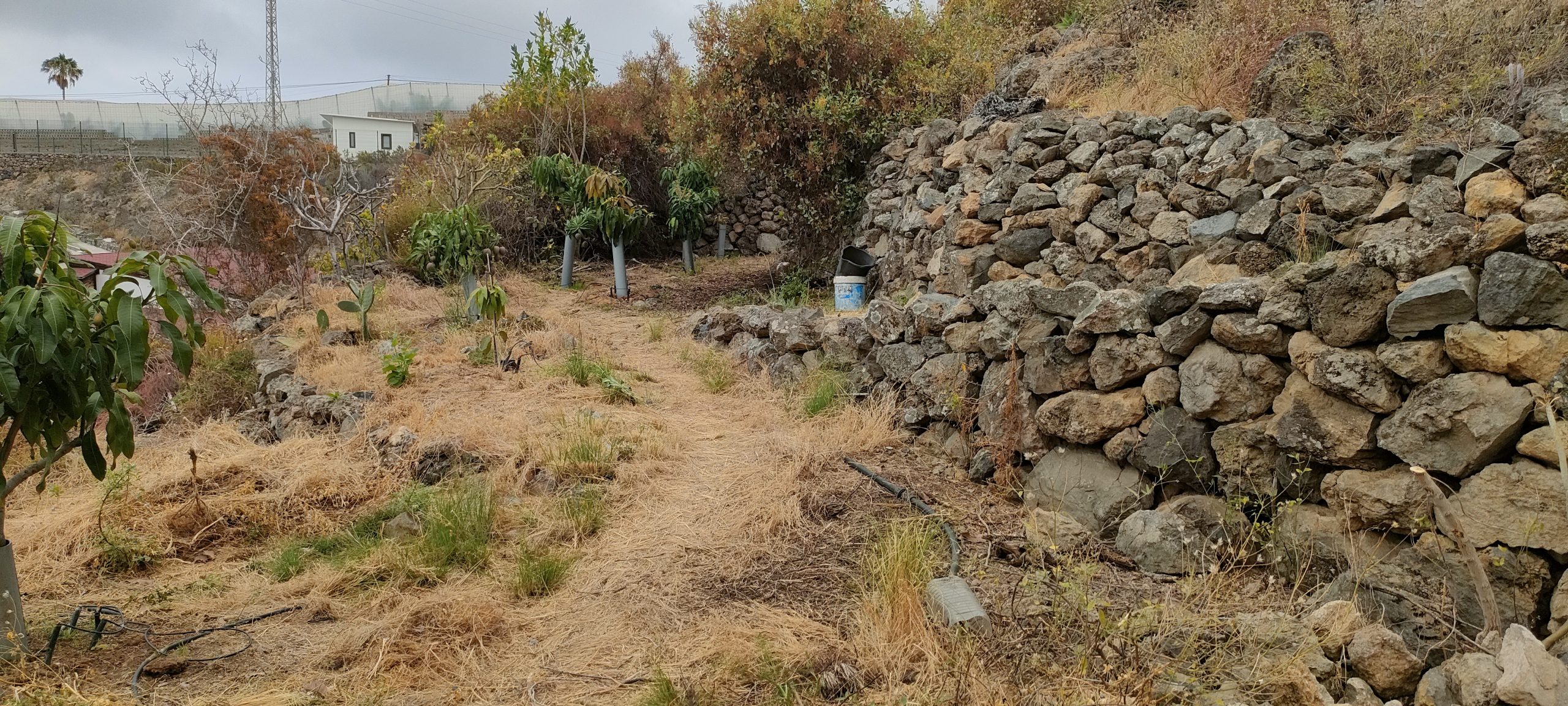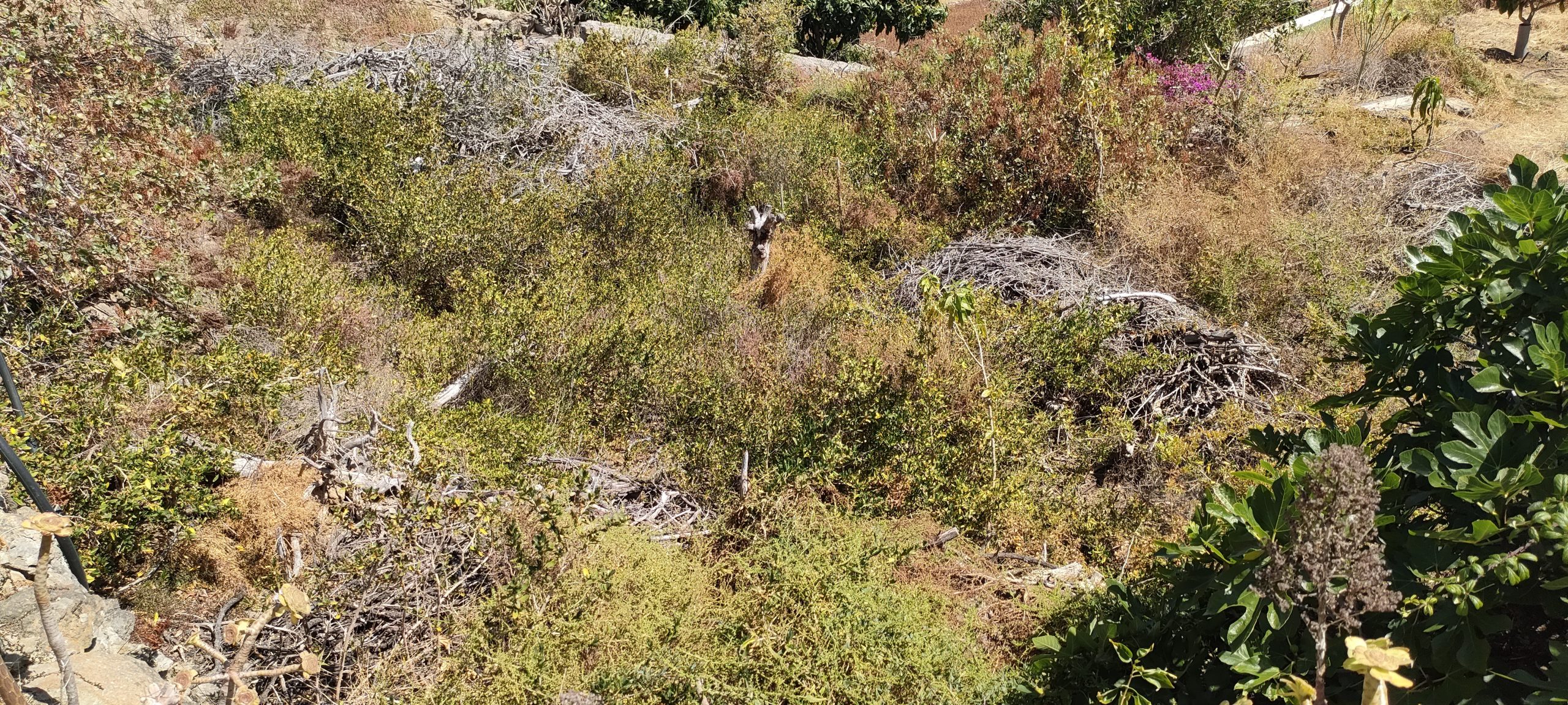 Viel von diesem Gestrüpp kommt bald frisch in den Häcksler.Aus dem Mangogarten gesehen. Die Pfosten, ganz oben, sind meine Ecken.Vom Orangengarten aus gesehen. 😀Erst wenn die Feige und das Gestrüpp weg sind, sieht man den ganzen Komplex!