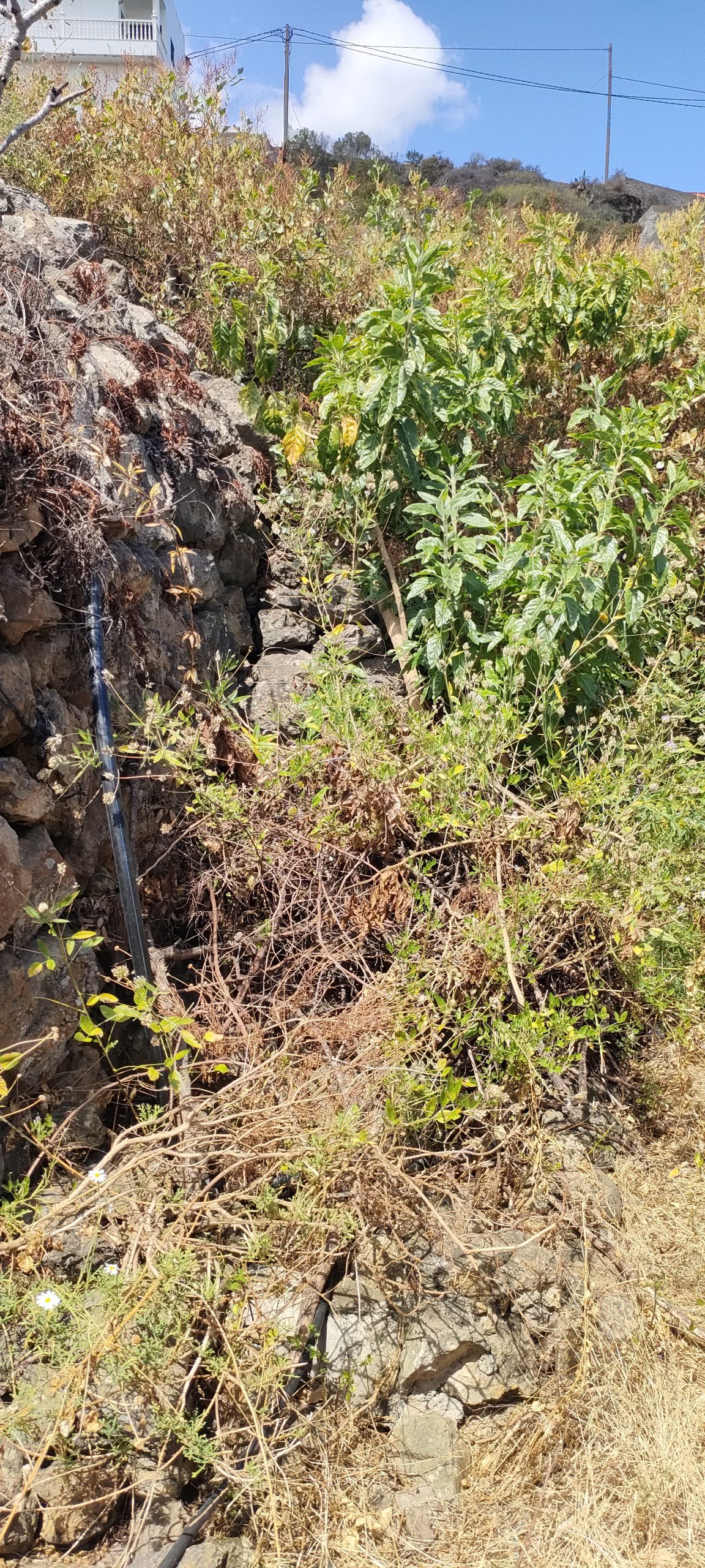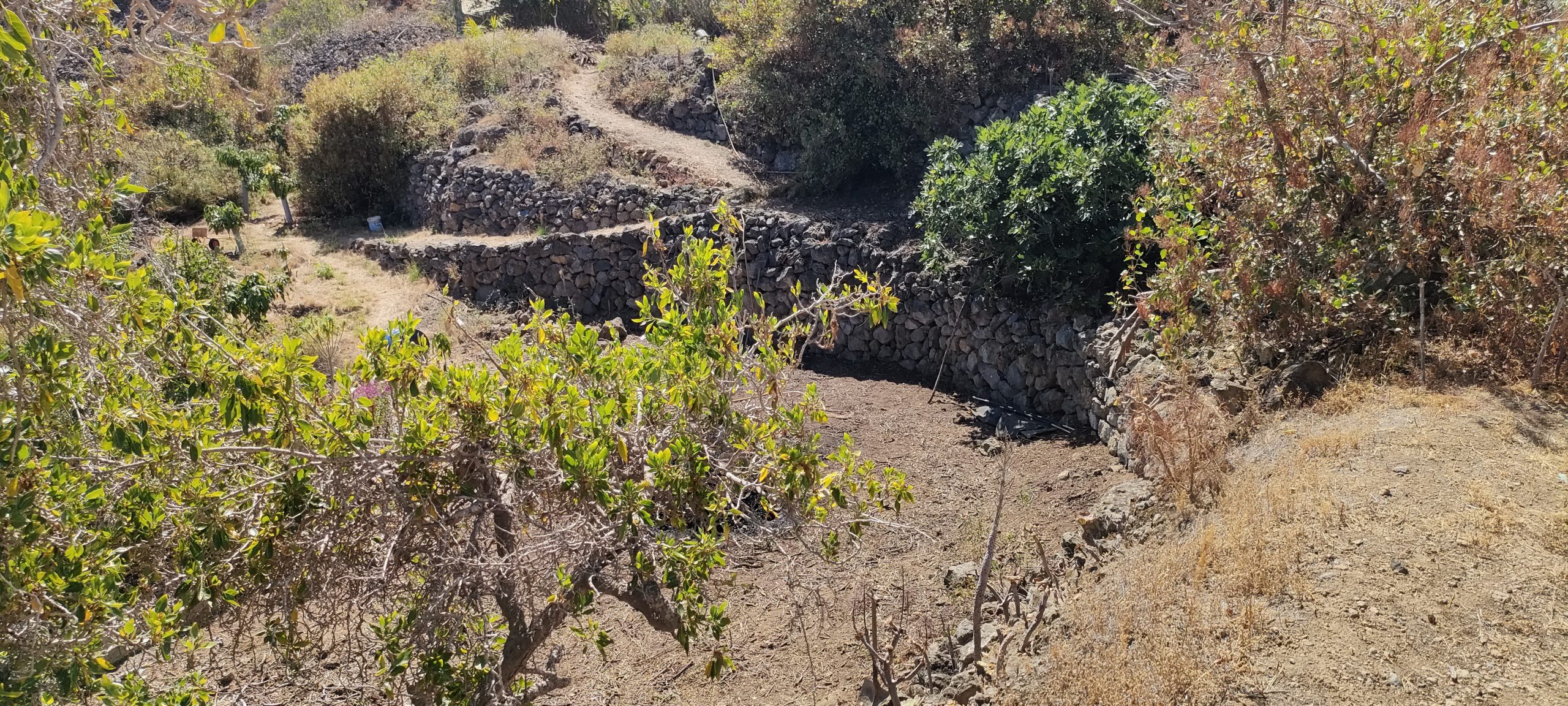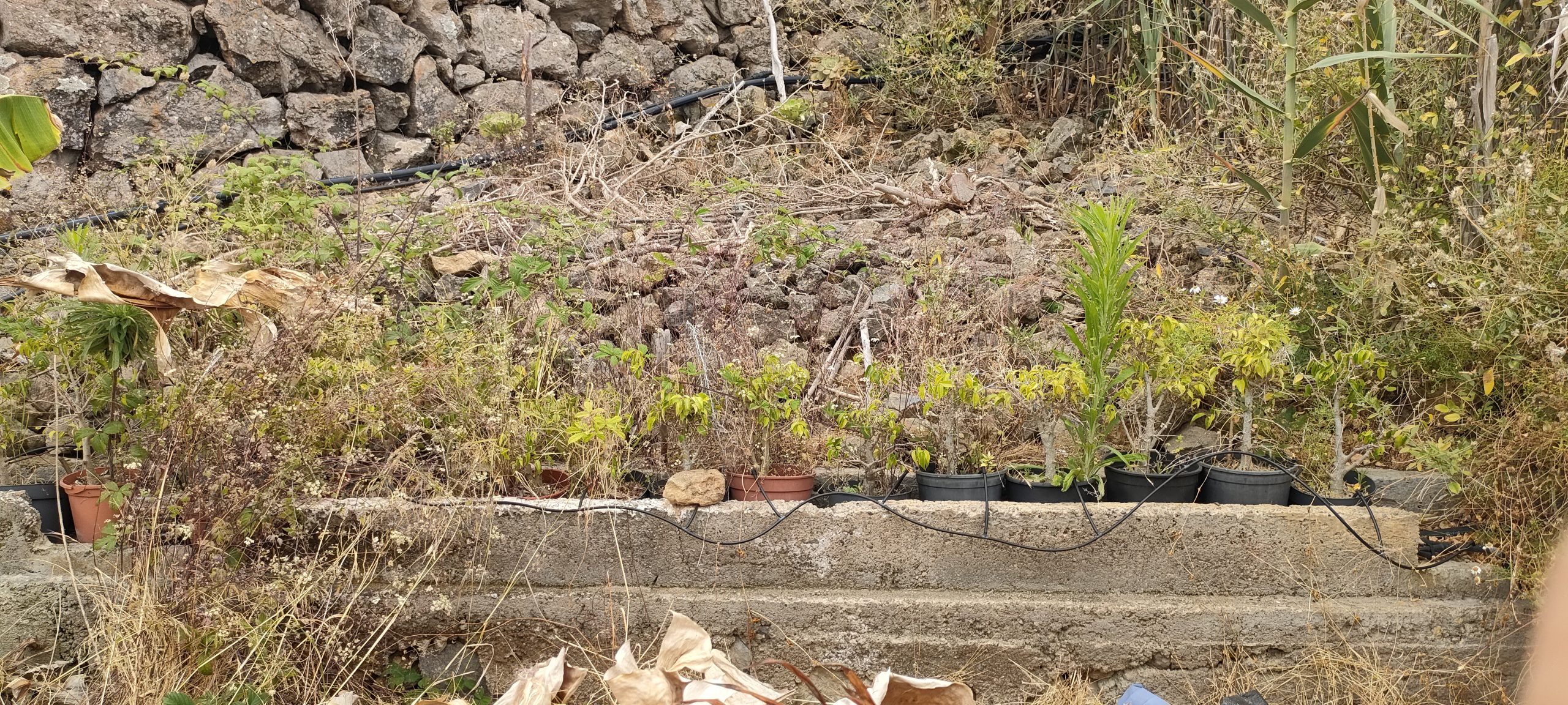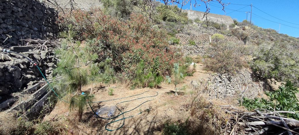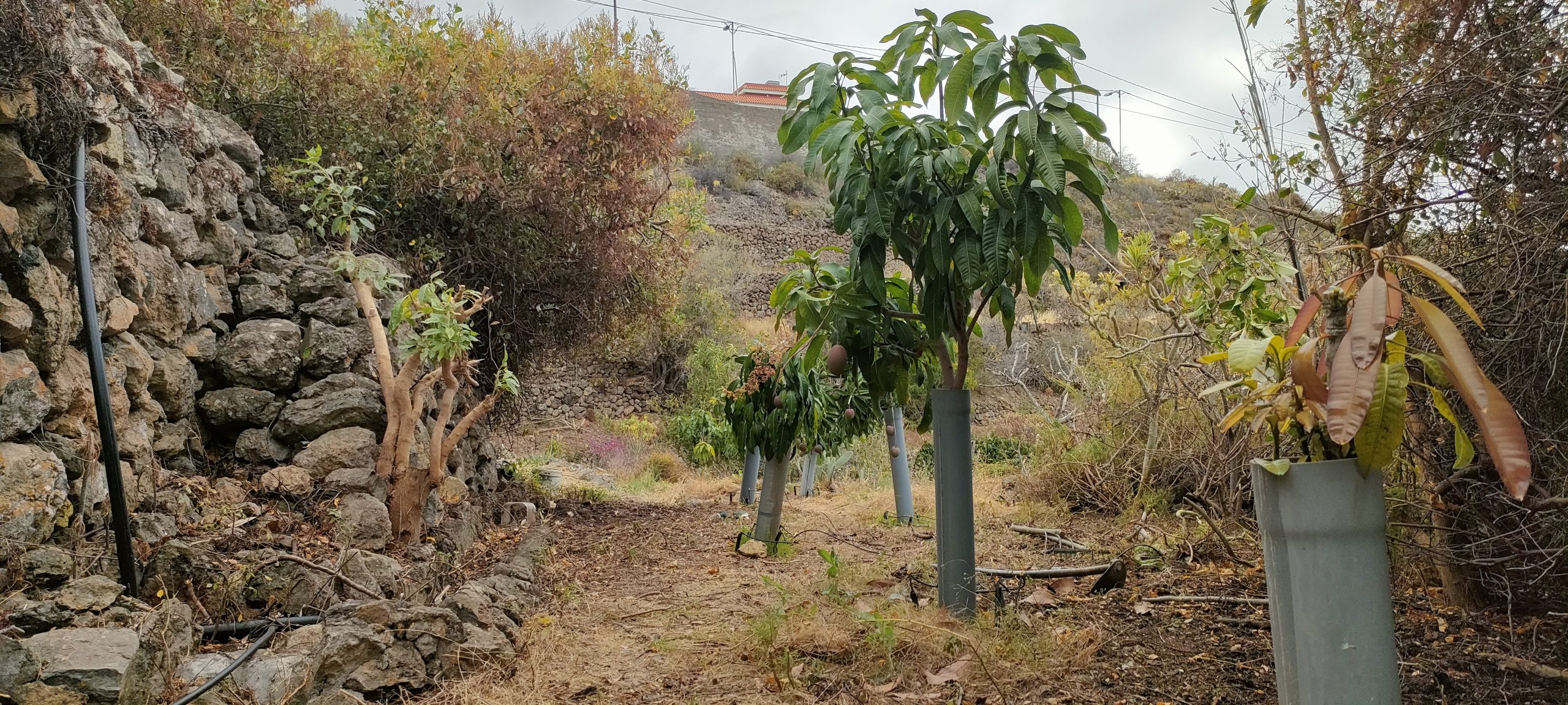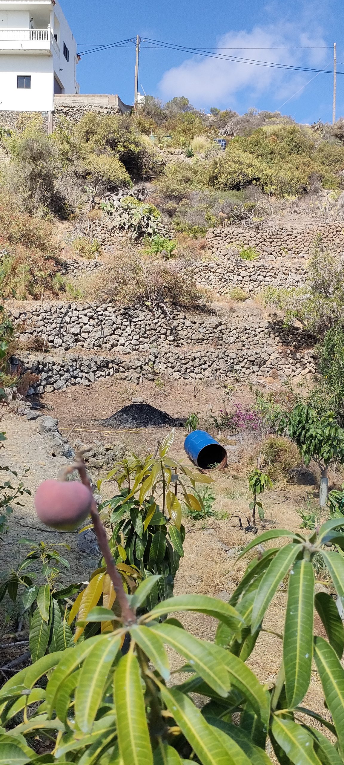 Viel von diesem Gestrüpp kommt bald frisch in den Häcksler.Aus dem Mangogarten gesehen. Die Pfosten, ganz oben, sind meine Ecken.Vom Orangengarten aus gesehen. 😀Erst wenn die Feige und das Gestrüpp weg sind, sieht man den ganzen Komplex!