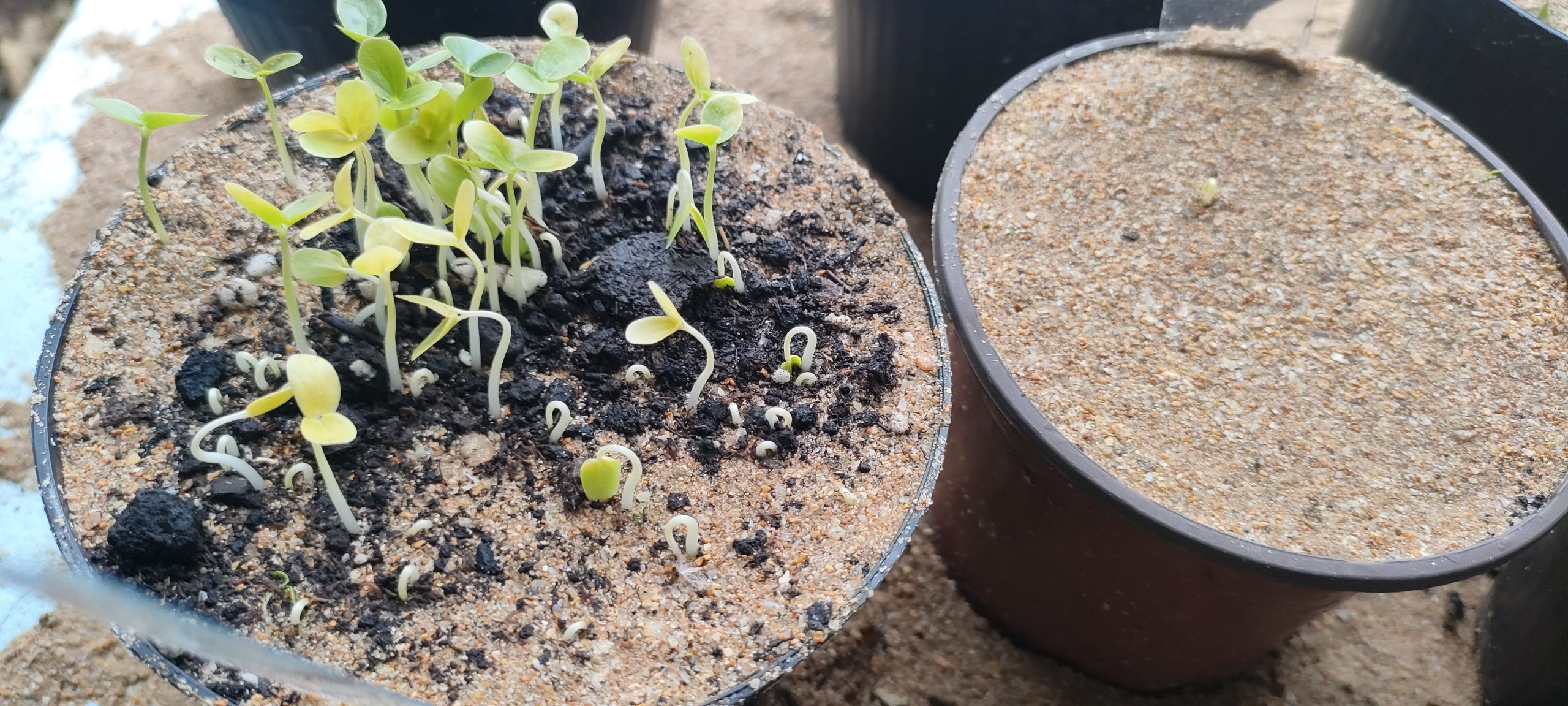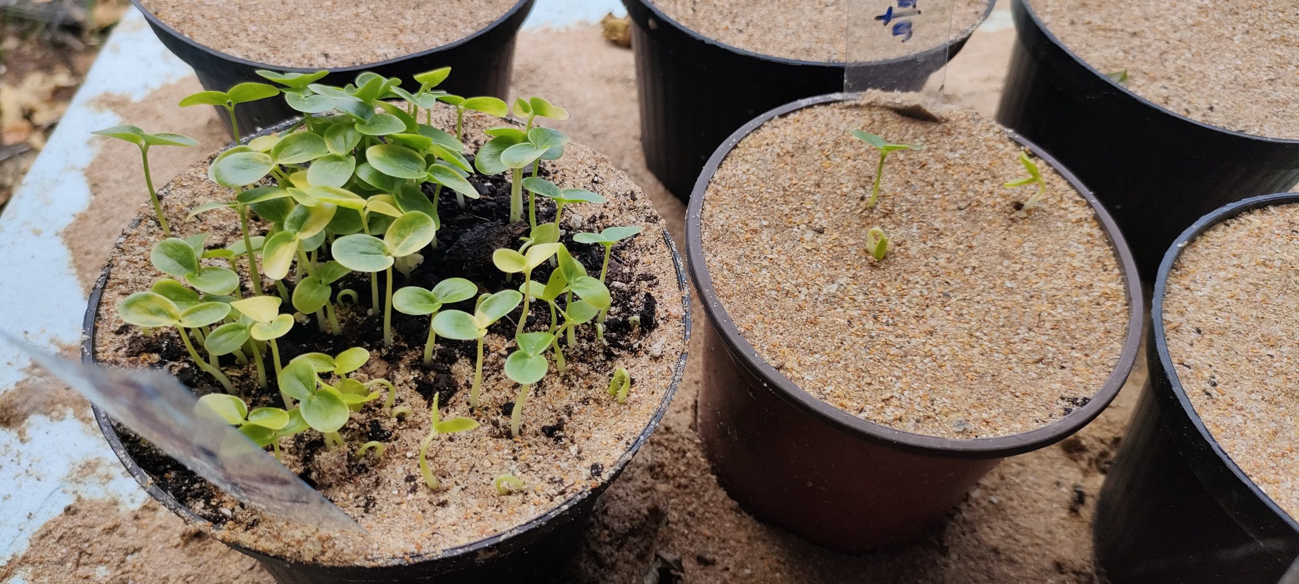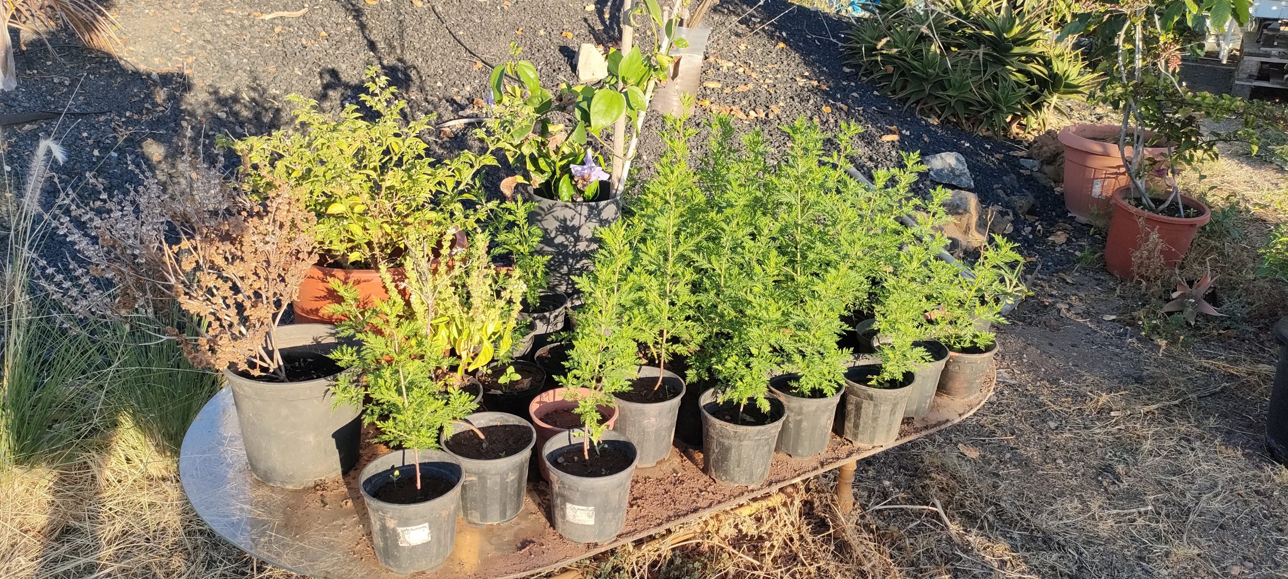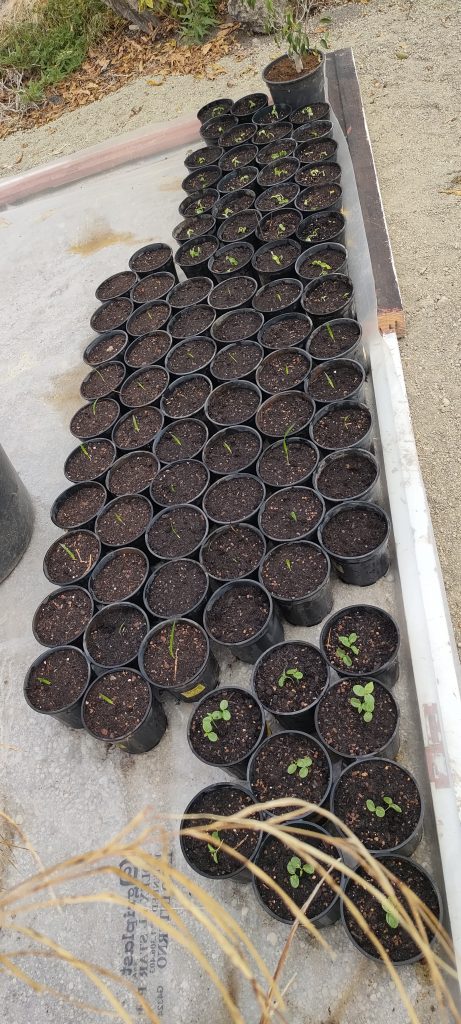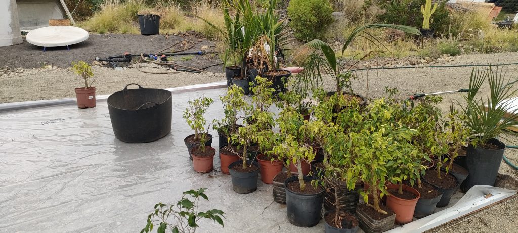 Neben den neuen Maracujas kommen ja noch vielerlei Bonsai Bäumchen und mindestens 29 Zwergdattelpalmen. Fast 100 Artemisia Stecklinge brauch ich gar nicht mehr umzuräumen, sondern kann sie direkt in den Boden stopfen. Damit werden wieder Töpfe für die Neuen frei. Jetzt wo ich weiß, wo ich all die Töpfe unterbringen kann, werde ich noch einige Samen nachsetzen.