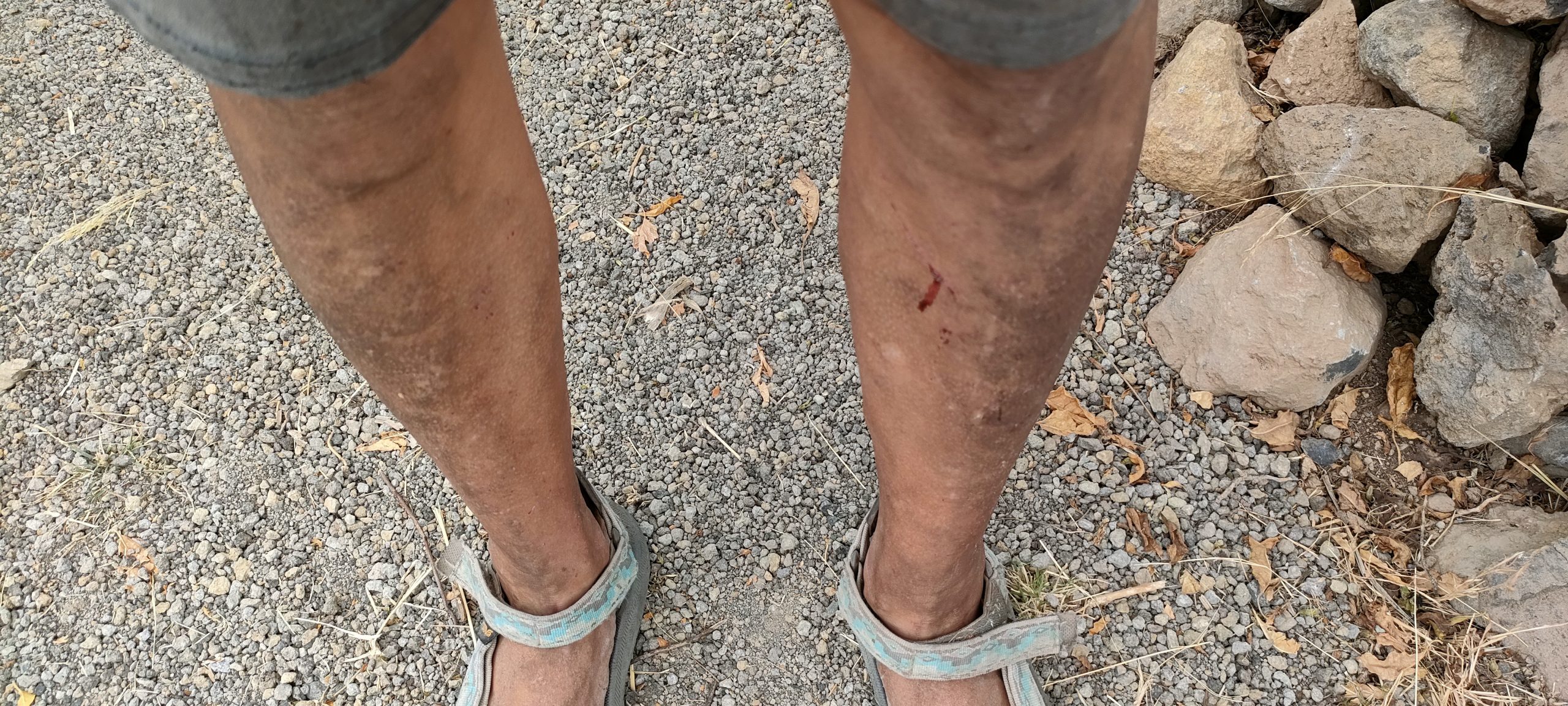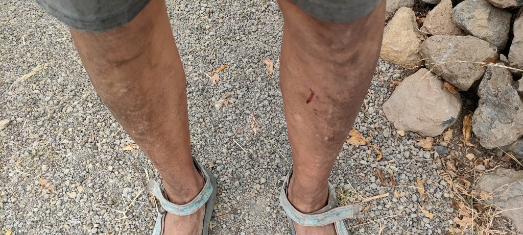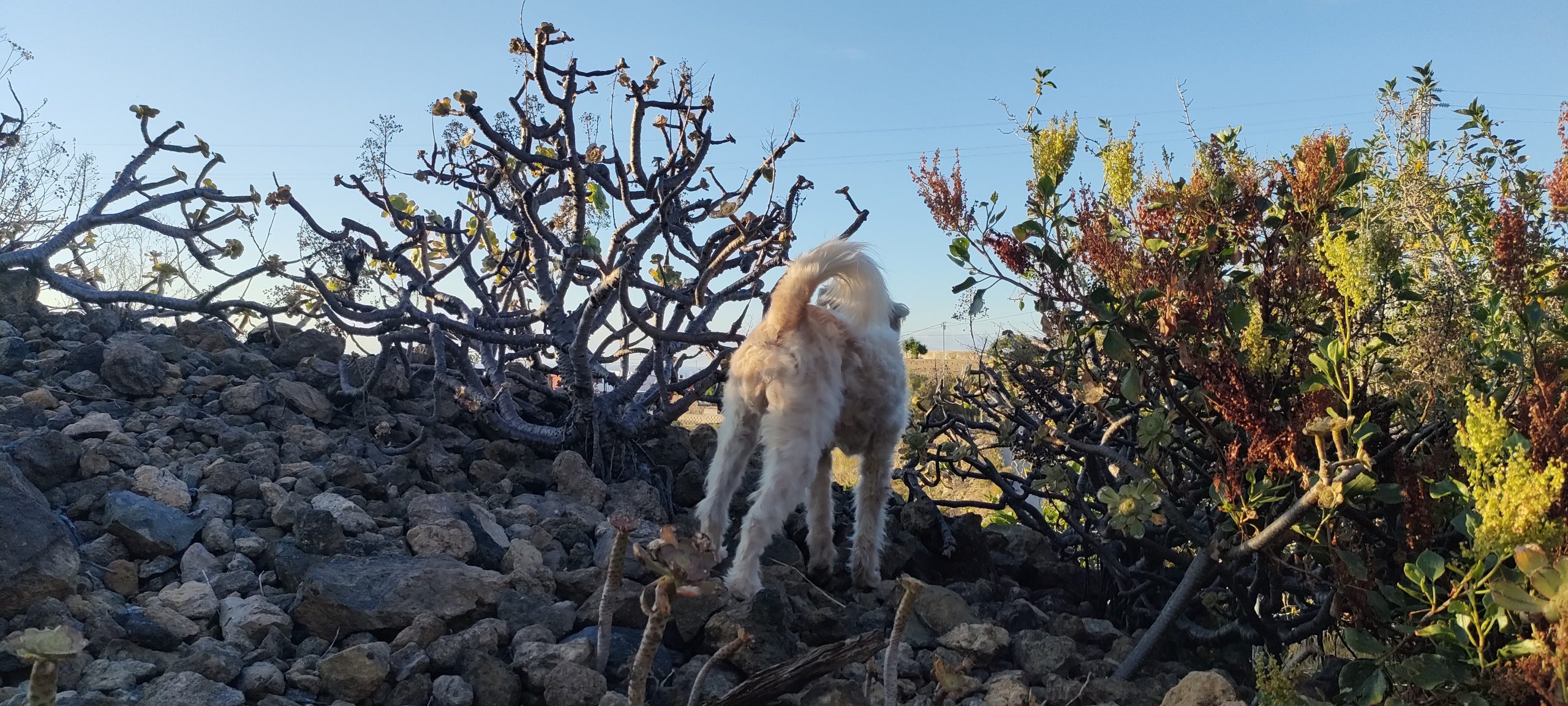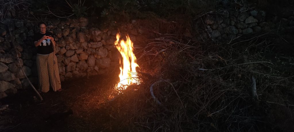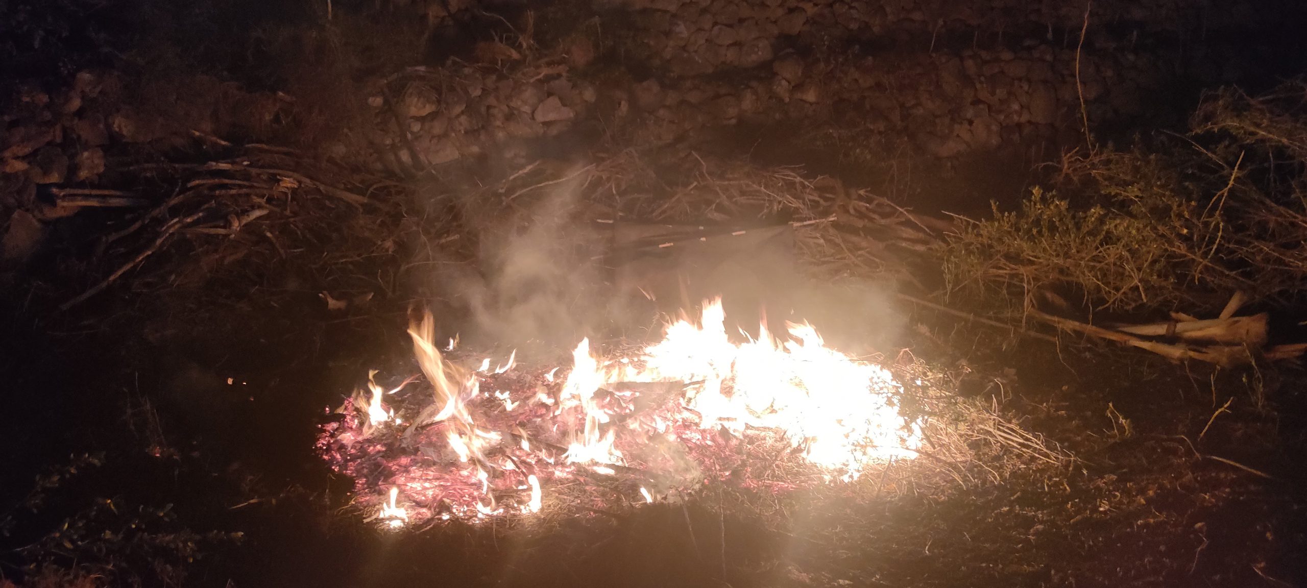 Leute: Von der nächsten Ebene zog ich tonnenweise Dornen und Kletten in die Arena. Teils kamen unwirklich fette Stämme dabei ans Licht und ich konnte mich an jeden einzelnen erinnern! Wie ich sie schwitzend, eingestaubt und mit einem Jucken auf Höchstlevel aus den Felsspalten reissen musste. Dornenschnüre, die wie federnde Lianen, aus 8 Meter Höhe auf mich zurück federten und mich beim Landen von Kopf bis Fuß mit Stacheln einwickelnden. Das Ganze hundertfach, wenn nicht gar tausenfach! Der ganze unmenschliche Albtraum, den ich vor fünf Jahren durchmachte, kam wieder bis ins Detail hoch! Es schüttelte mich, als ich zum letzten mal ganze Nester dieser Dornen in den Armen, oder auf der Mistgabel hielt und dann ab ins reinigende Feuer! Es waren fünf Jahre, in denen ich den Großteil nicht beseitigen konnte, weil es einmal kein Wasser gab, zwei mal Plandemie und einmal war ja allein die Hochebene kaum zu schaffen! Es fühlte sich an wie fünf Jahre Jucken, für das es kein Kratzen gibt und diese Nacht war zutiefst und spirituell reinigend!