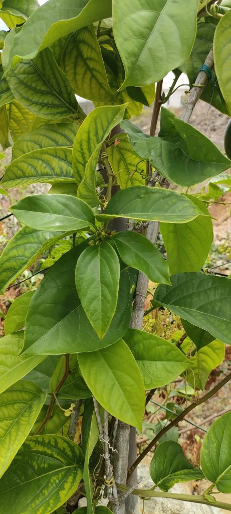 Hier hab ich noch ein Bild von der Granadilla „Alata“. Man erkennt die älteren Blätter, die gelb werden, als hätten sie Eisenmangel. Trotz Eisendünger hatten sie gelbe Flecken und waren fast schon transparent! Mit dem neuen Organic Dünger wirken sie ledriger und sehen viel solider aus!