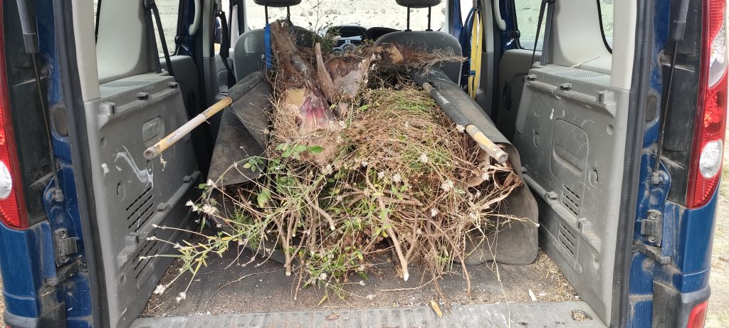 Beim 14ten Auto hatte ich aber erst die linke Seite! Pro Ladung lief ich 200m. Und fuhr nochmal 200m. mit dem Auto, weil es zur Feuerstelle auch noch bergauf geht.