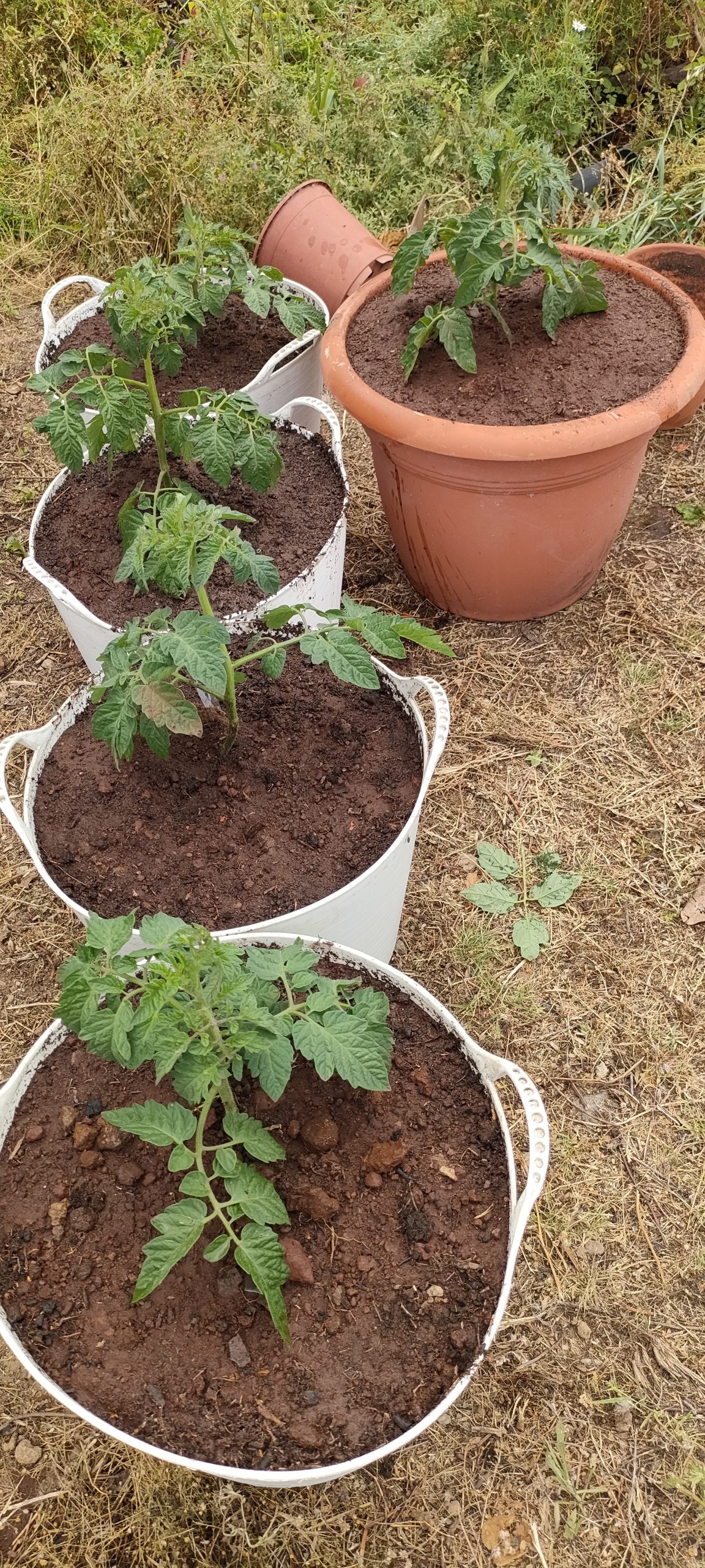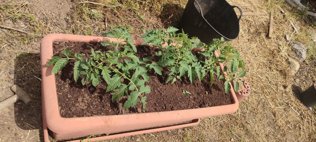 Dennoch geht es auch mit dem Gemüse weiter. Hier sind nochmal drei normale, frühe Tomaten, die nicht so groß werden. 16 Pflanzen sind schon versorgt und mindestens zwei folgen noch.