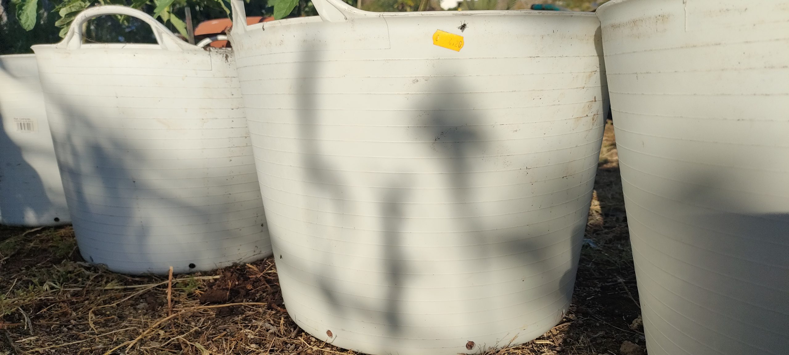 Diese vier Kübel, kosteten zusammen 16,80, sind weiß und heizen sich damit erst gar nicht auf. Extrem flexibles, gummiartiges Plastik, mit Griffen, die bei brutalster Steinearbeit ein Jahrzehnt überstehen können! Die Löcher kann ich auch selber bestimmen!