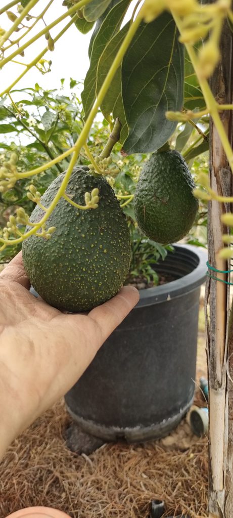 Hier halte ich eine neben meine größte Frucht, die ebenfalls an Toniˋs Bäumchen hängt! Es könnte durch den veredelten Trieb, also exakt derselbe Baum sein! Bananentoni meint, er habe alte und neue Früchte dran hängen. Nebenher blüht er auch noch und er habe rund ums Jahr Ernte.