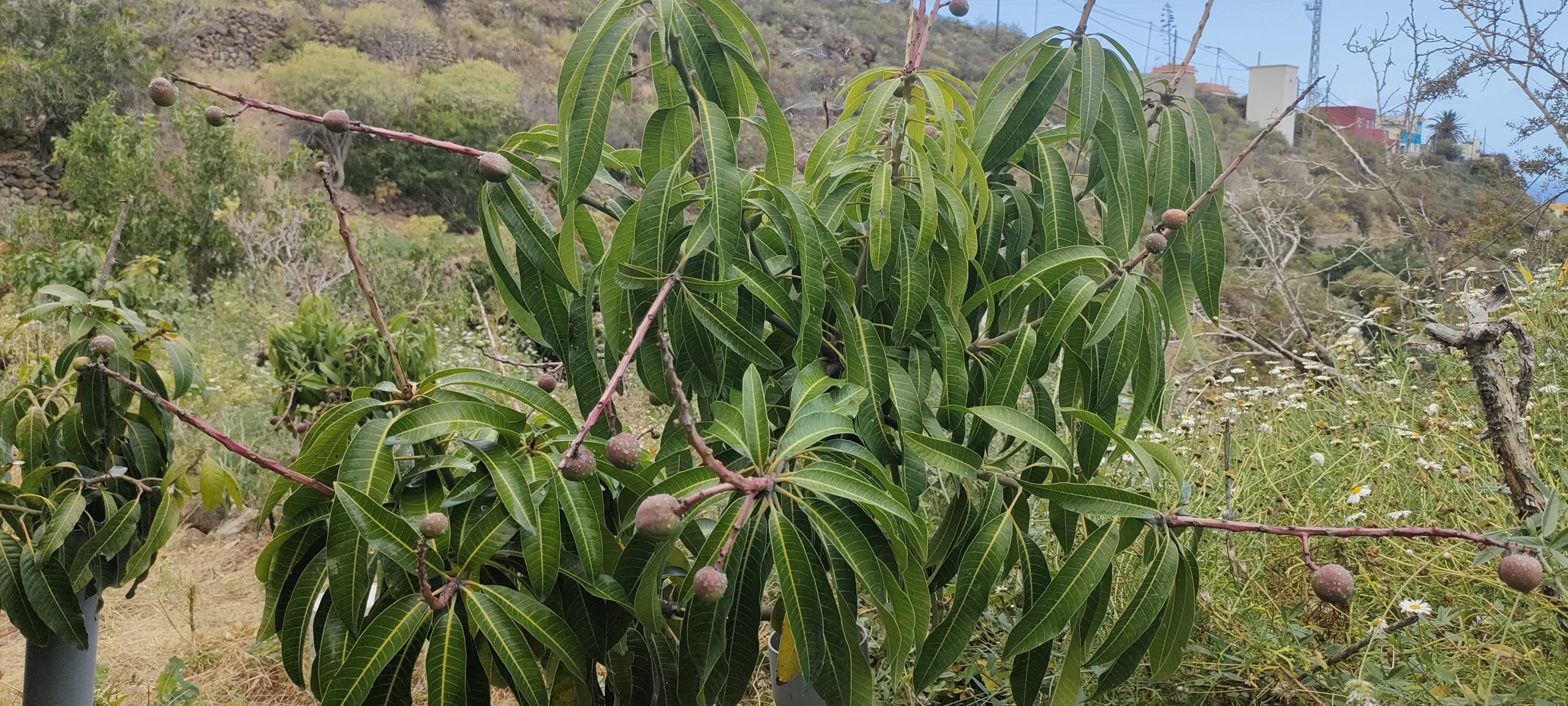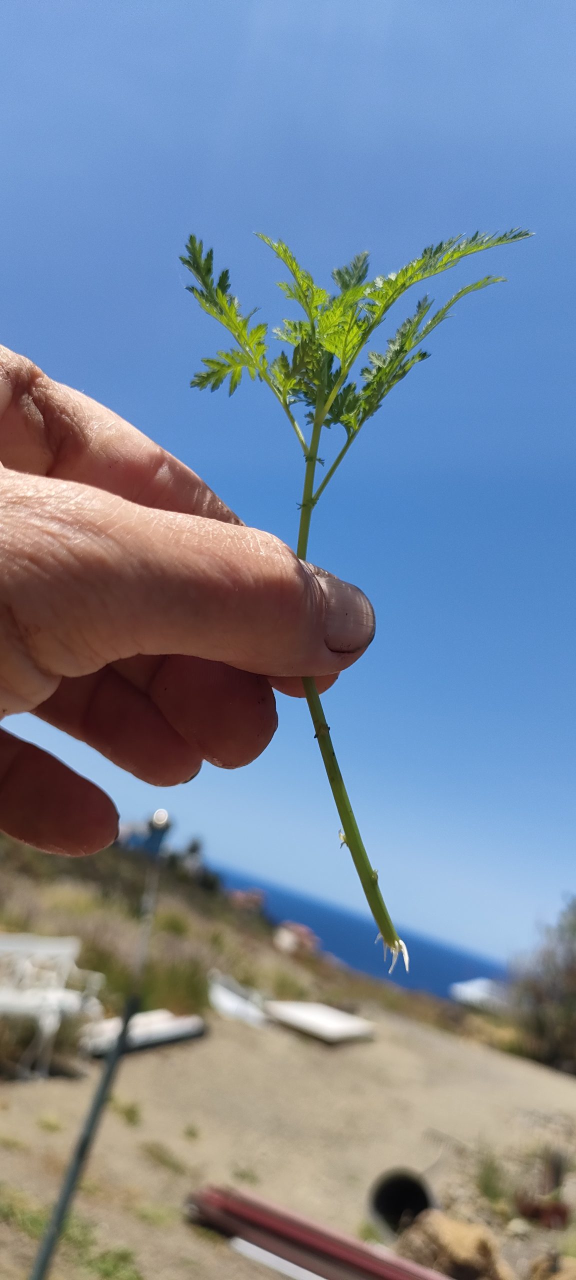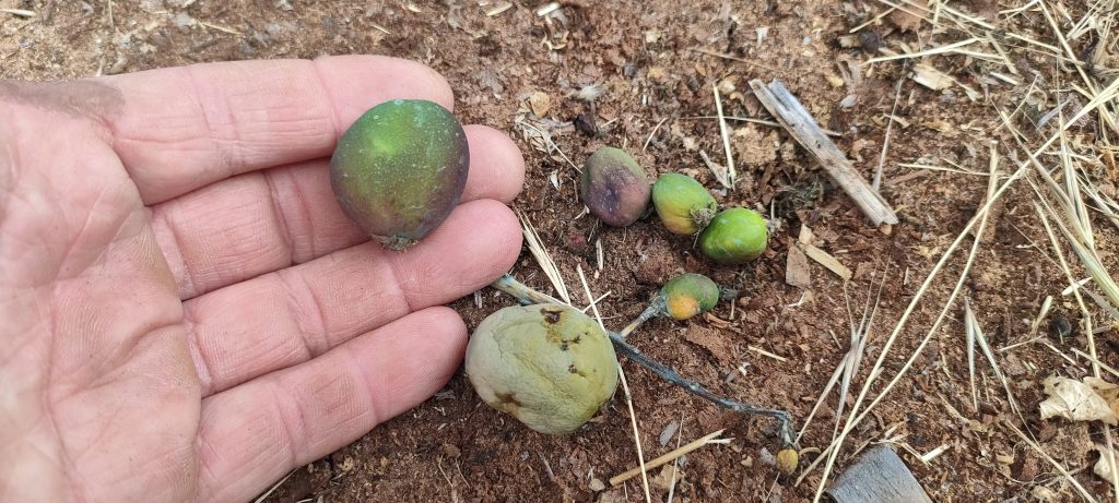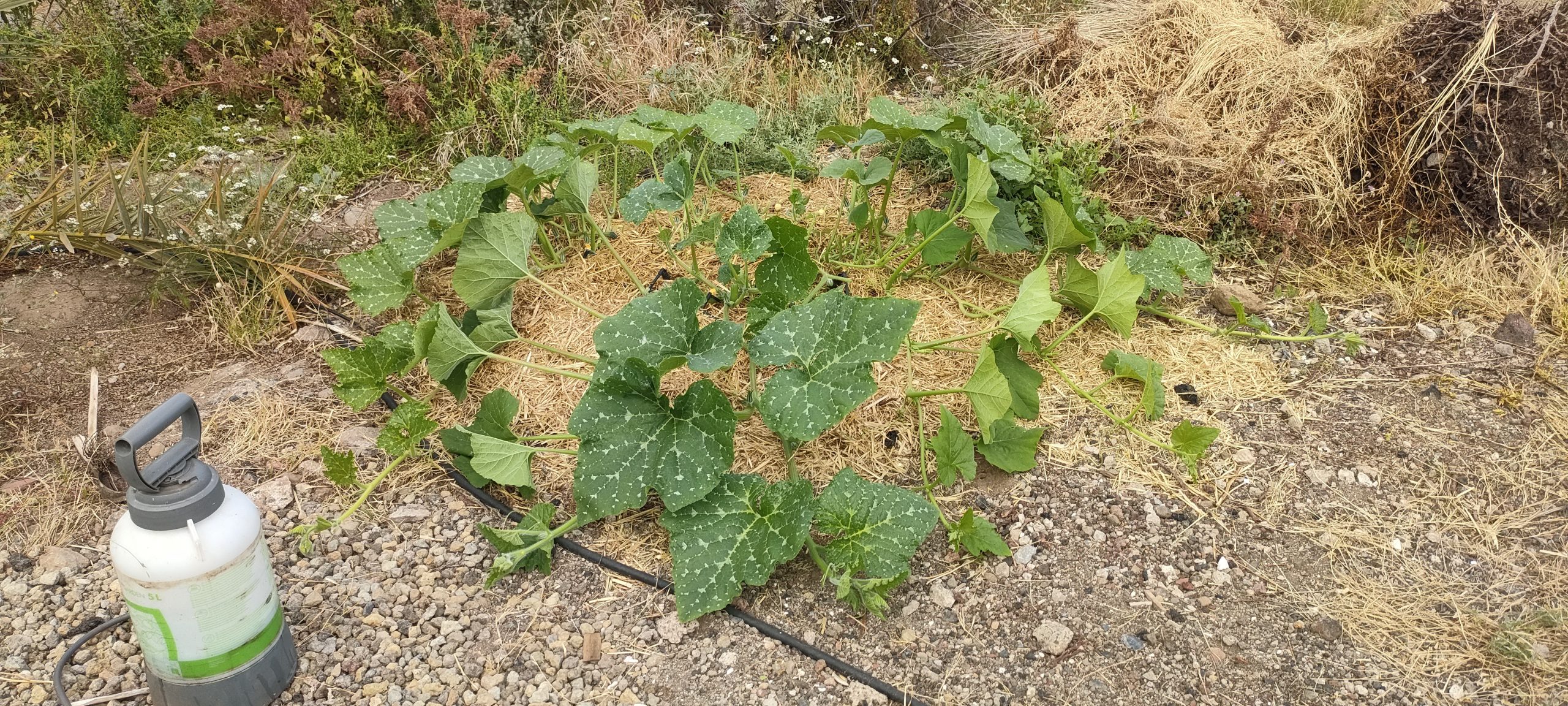 Grüntee. ➡️Kürbisse ausdünnen und gegen Mehltau sprühen.Dasselbe Fungizid geht an die neuen Mangas. Diese „Manzanailla“ bekommt ein Probefrüchtchen.
