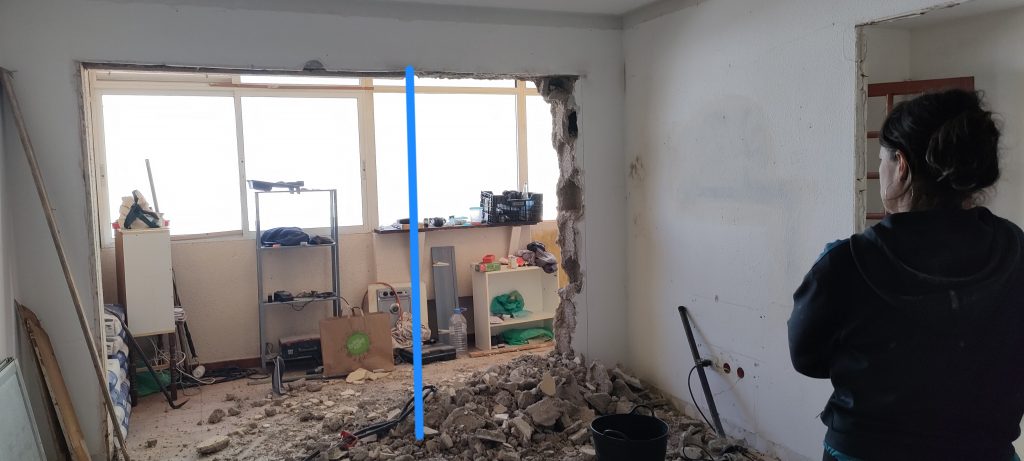 Neben einem großen Doppeltürrahmen, haben wir eine Wand ziemlich weit aufgemacht. Rechts. Im Hintergrund sieht man eine Glastür. Das ist eine weitere Doppel Flügeltüre. Wenn man jetzt die rechte Türe noch verbreitern würde, dann hätte man auch das Licht von dieser Seite im Blick! Das ist nicht meine Entscheidung und vor allem ist es die Frage, was man hier überhaupt an Schiebetüren bekommt, weil eine Schiebetür sollte es schon sein.
