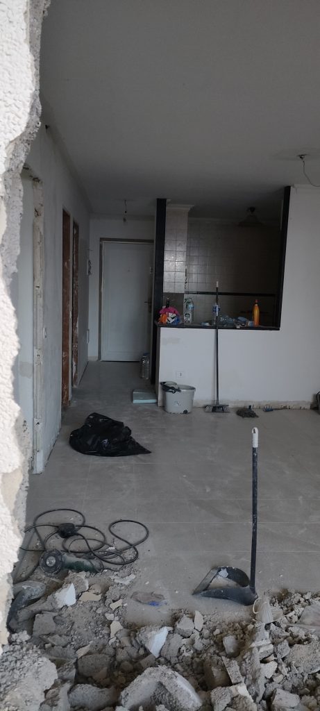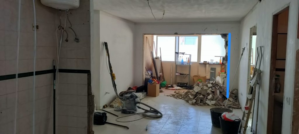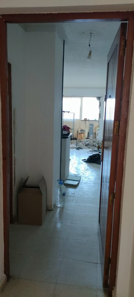 Die Trennwand rechts ist jetzt auch raus, weil sie kaputt war, wird aber wahrscheinlich durch eine Trockenwand mit versetzer Türe ersetzt. Wäre cool, wenn diese Türe so sitzt, dass man bei geöffneter Türe dieses Licht auch noch mit bekommt. Die Fenster zeigen Richtung Norden, was hier eigentlich Gold ist, weil sonst sieht man hier eigentlich fast nur geschlossene Fensterläden! Hier reicht schon die ständige Reflektion der Sonne!