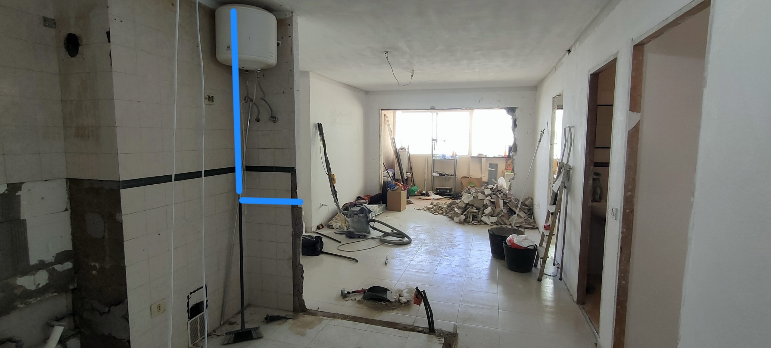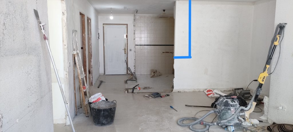 Kabel und Boiler versetzen und dann können die Bauarbeiter, vom Eingang aus, alles verputzen. Bis dahin muss der Durchbruch in den Wintergarten fertig sein und die sind verdammt schnell!