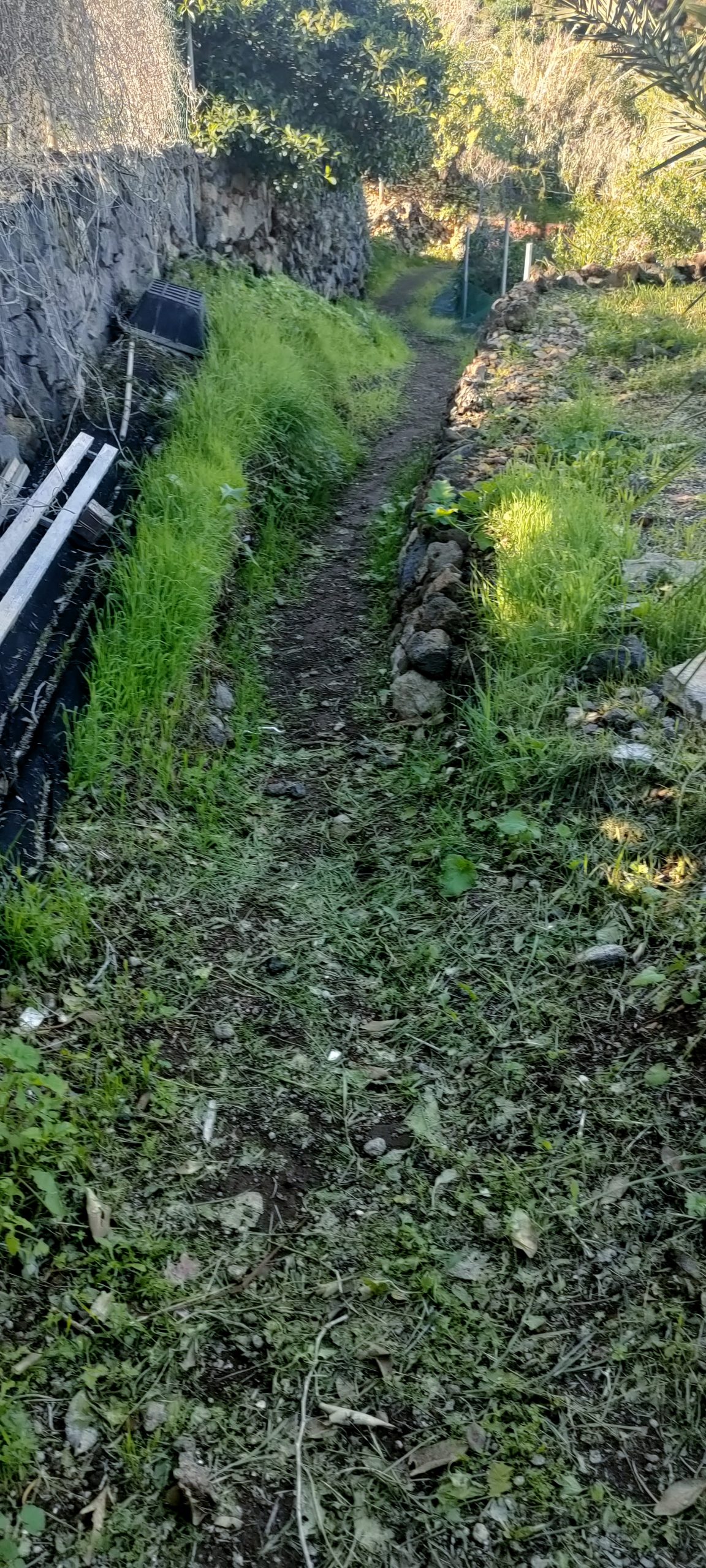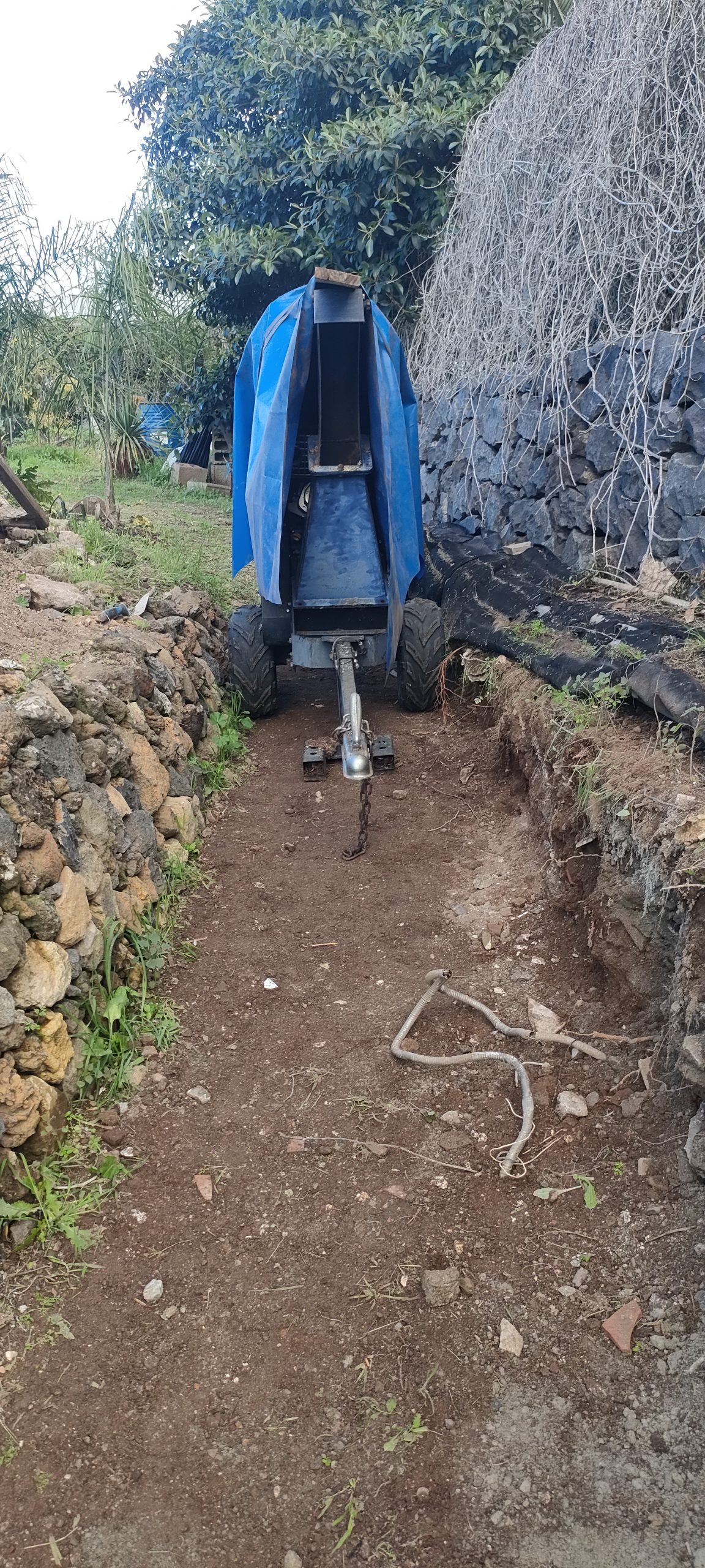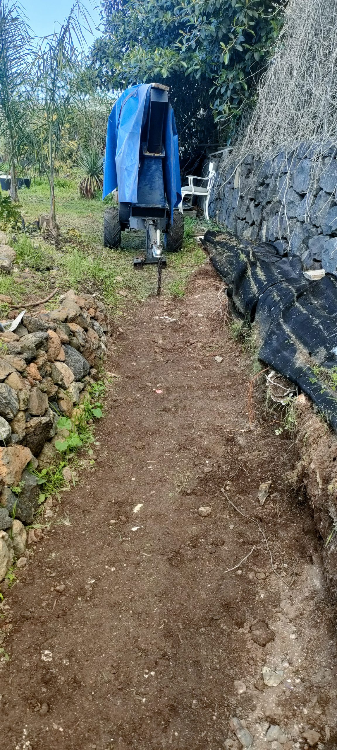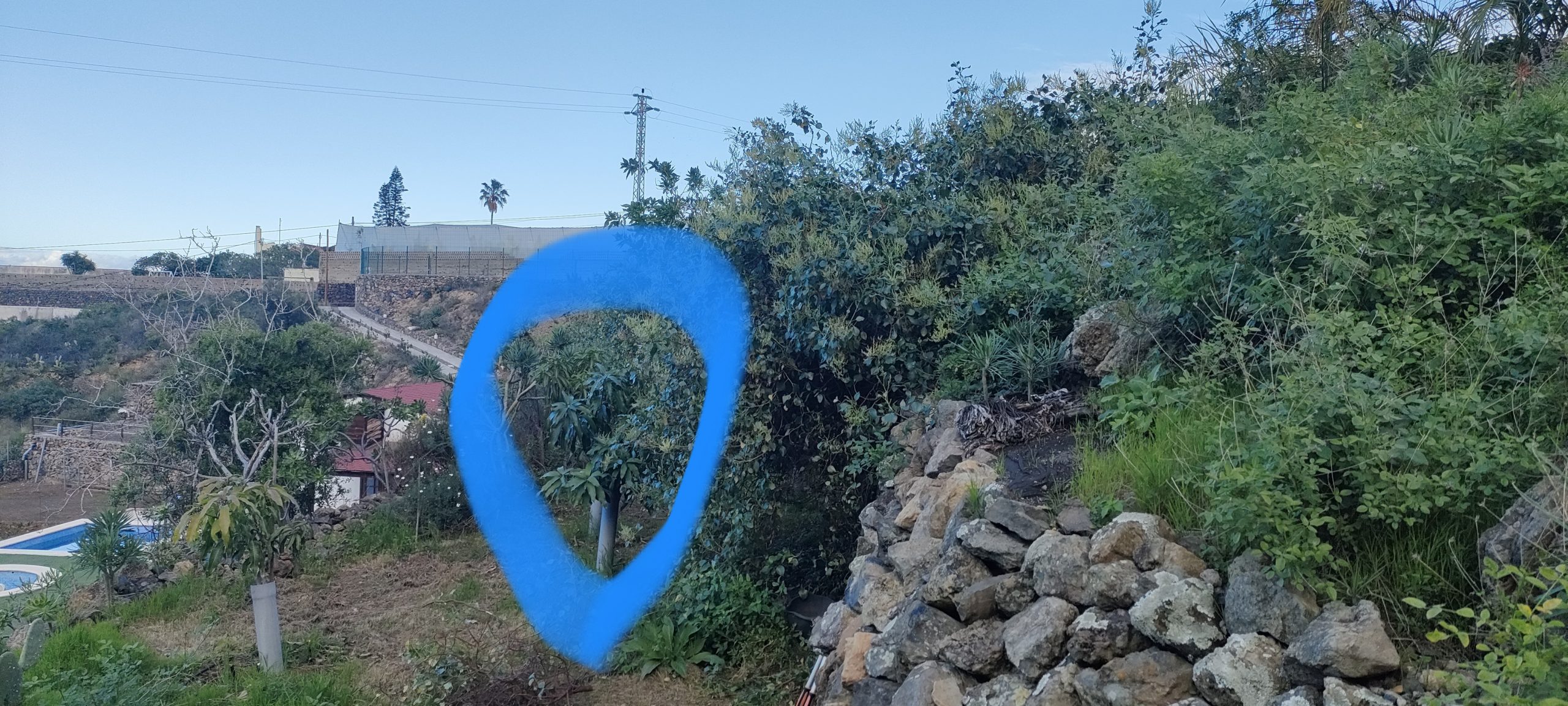 ⬆️ Endlich kann ich die Büsche direkt klein häckseln! Blau markiert, ist ein Manga Baum, der überhaupt keine Sonne mehr bekommt. Zwischen diesem und der Mauer war mal der Weg.