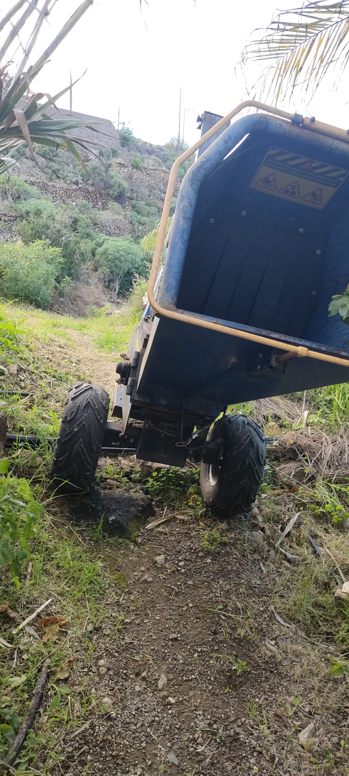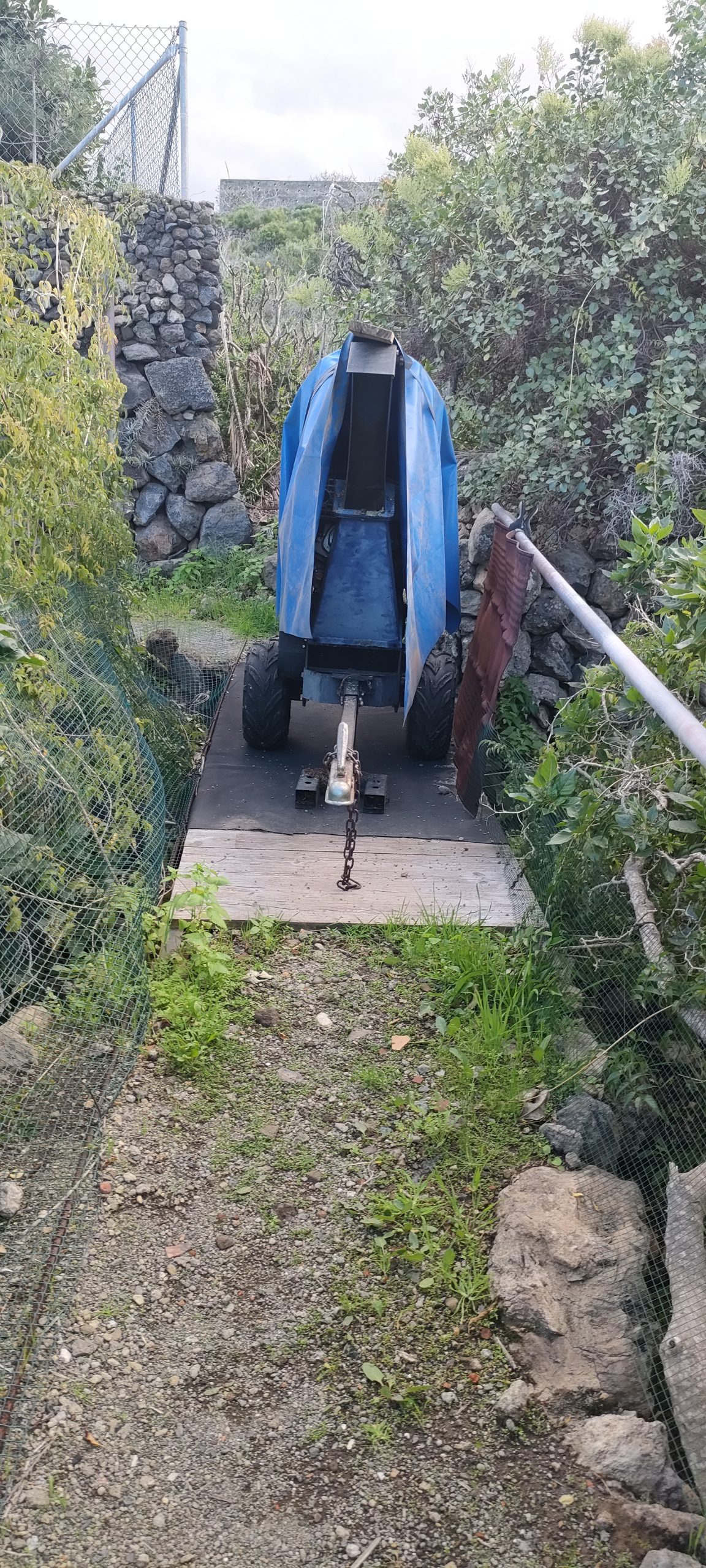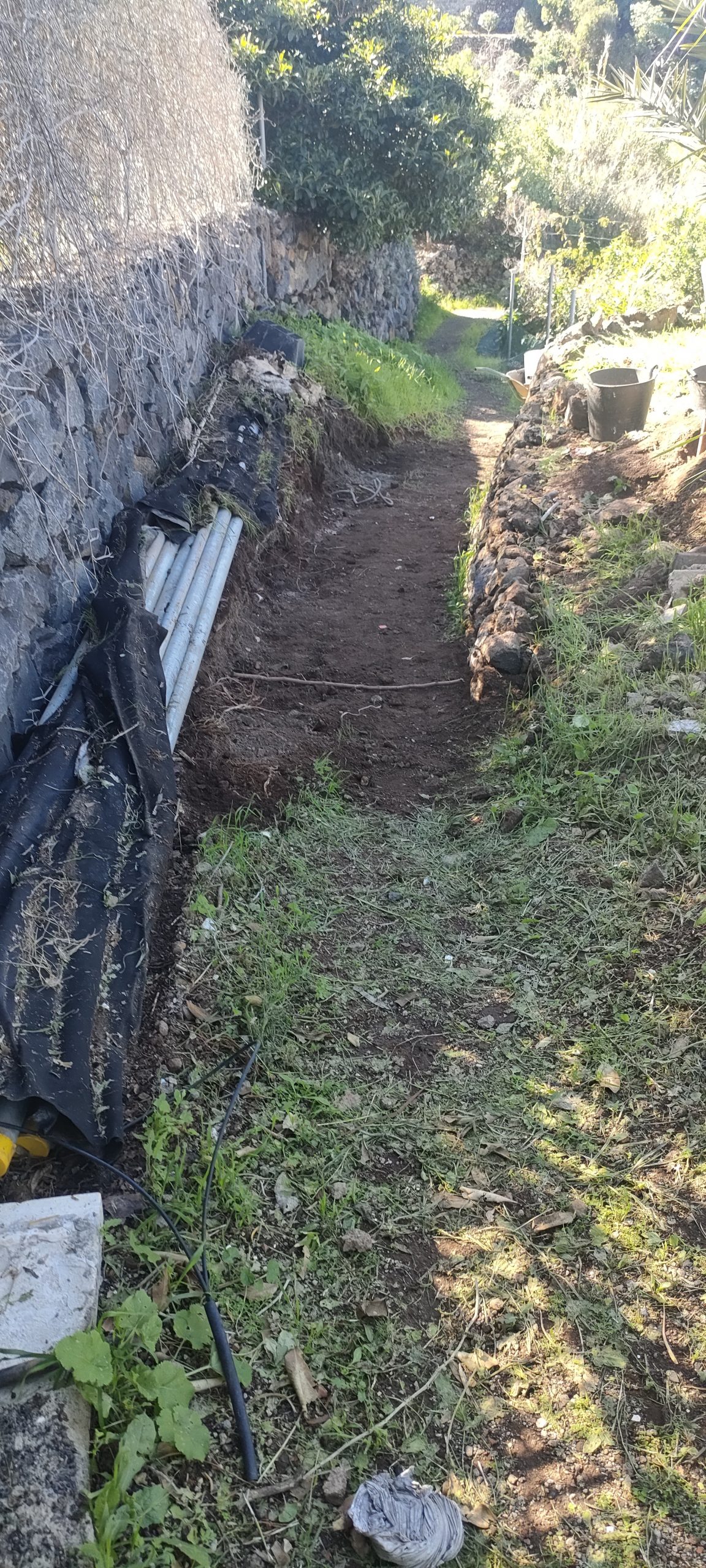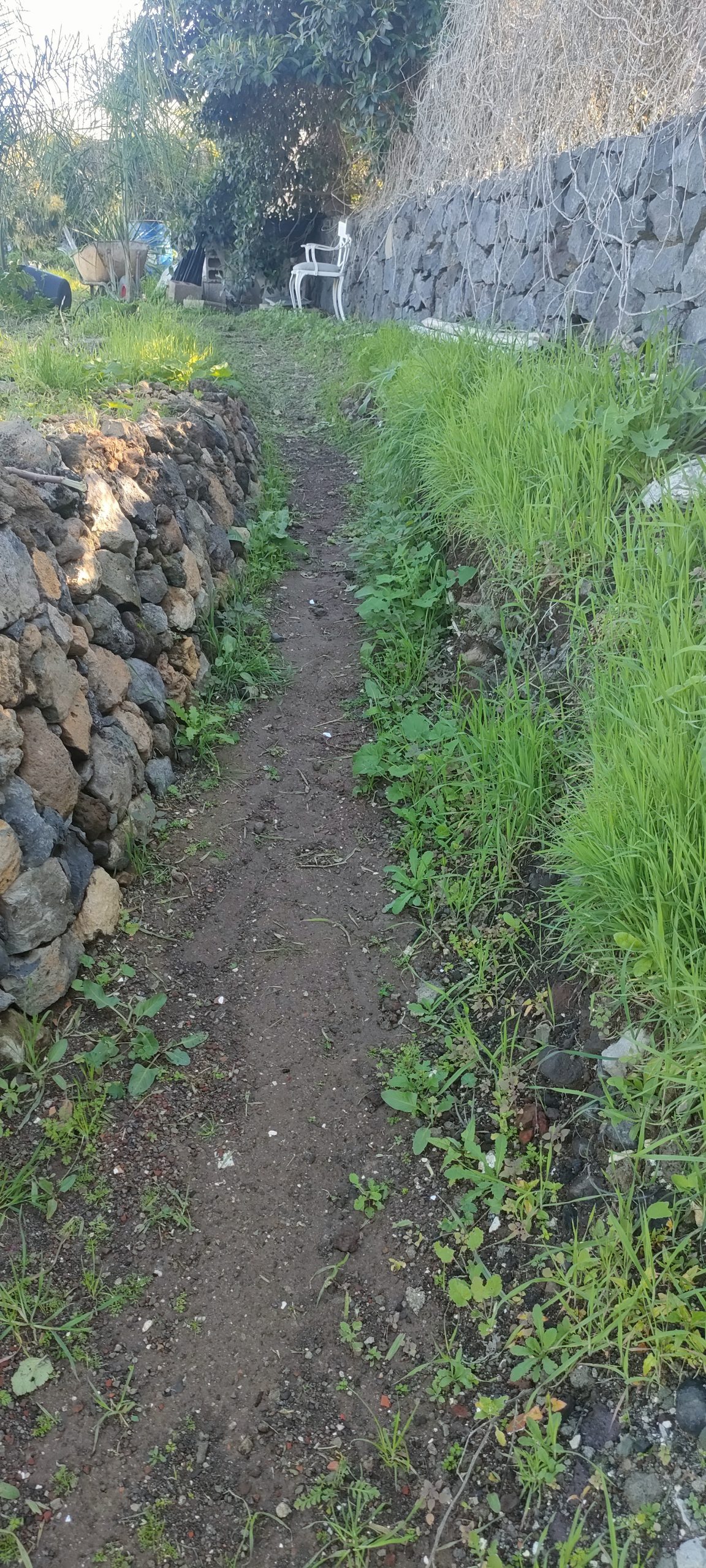 ⬆️ Endlich kann ich die Büsche direkt klein häckseln! Blau markiert, ist ein Manga Baum, der überhaupt keine Sonne mehr bekommt. Zwischen diesem und der Mauer war mal der Weg.