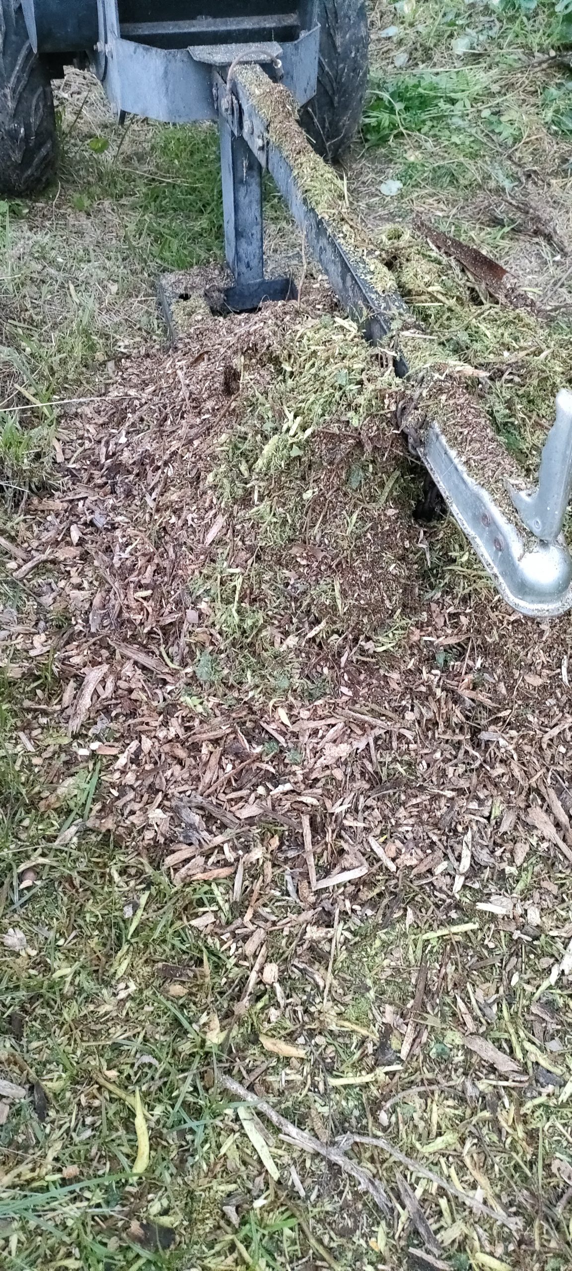 Da liegt schon der erste geschretterte Busch und das braune Zeugs kommt von dem Altholz. So ein Häufchen könnte gerade mal reichen, um ein Bäumchen zu mulchen.