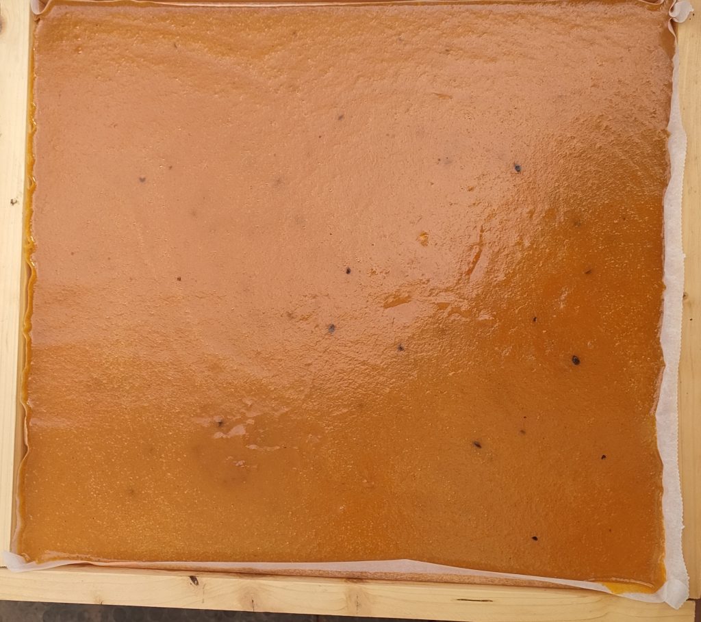 Wieder ein Experiment mit Agar Agar. Aber diesmal mit Zucker. 50gr. auf 500gr. Früchte. Das kann ja bis zu 90% trocknen, was allerdings stark vom Gelatine und dem Zuckeranteil abhängt! Je mehr von beiden dazu gemischt wird, desto weniger schrumpft das Ganze.