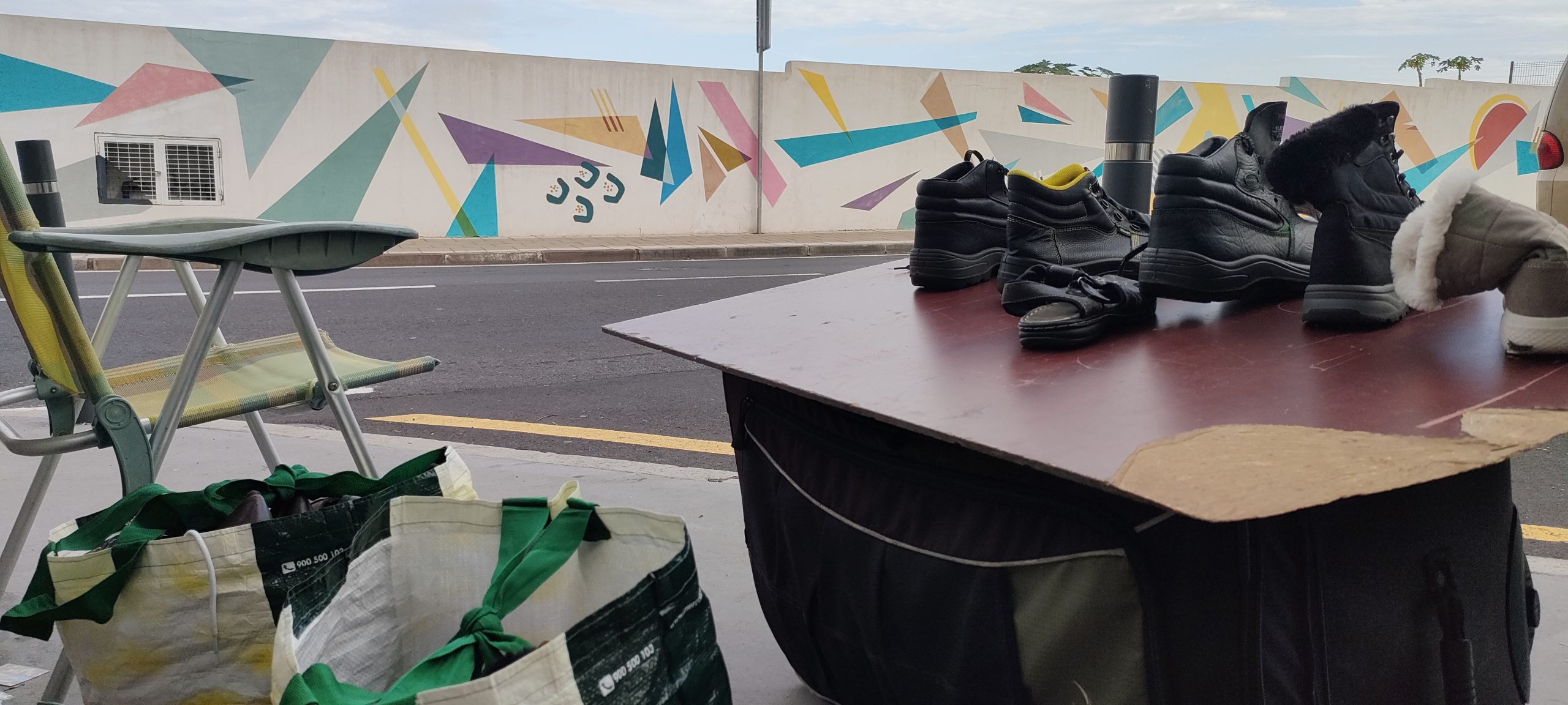 Die Maschine stand bereits, als mich ein agressiver Typ amschrie und vertreiben wollte! Sofort stellte er vor der Maschine alles voll um mich zu blockieren. 🤦🏼♂️ Jetzt setzt er sich mit Campingstuhl vor mich hin und baut auf einem Koffer Schuhe auf.