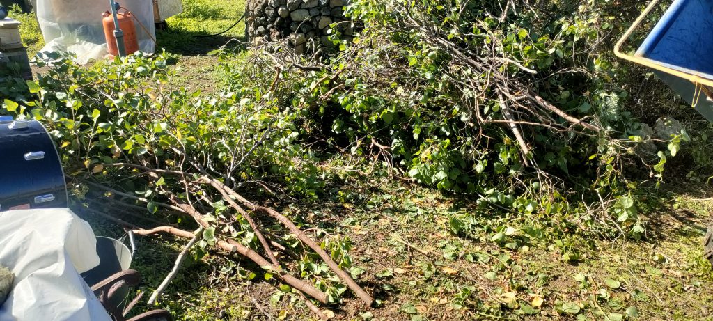 5 schwere Schubkarren Mulch. Das Zeugs ist so grün, pampig und stickstoffhaltig, dass es, als Haufen, sofort in die Heißrotte gehen würde.