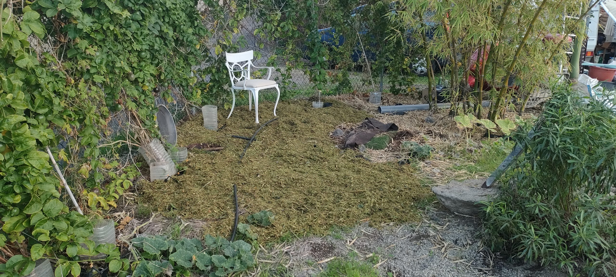 Am Zaun, hinter dem Bambus, schützt noch der Mulch vom letztem Jahr vor Unkraut. Der alte Mulch war aber spärlich und das Kraut wucherte gerade wieder los. Teils, warf ich den Mulch, ebenfalls zu Testzwecken, einfach aufs Unkraut. Der Bambus, mulcht sich, über die weiteren Meter nach rechts, selber ein. 👍