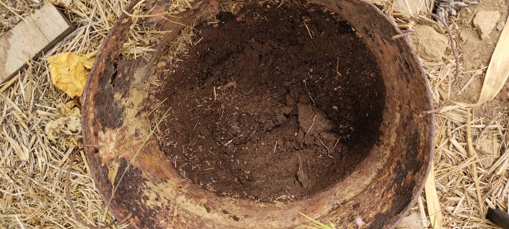 Nach spätestens einem Jahr kann man wieder den gesamten Inhalt an die Oberfläche bringen und somit jährlich Humus bilden! Fast schon eine Notwendigkeit um Platz für neue Abfälle zu schaffen! Bald kommt ein Deckel aus Weizengrasresten drauf, der bereits von Hühnern vollgekackt wurde. Seit dieser Plan steht, mache ich mehr Erde ins Weizengras, damit mit den Resten ein schöner Erdpuffer für die Würmer geschaffen wird!