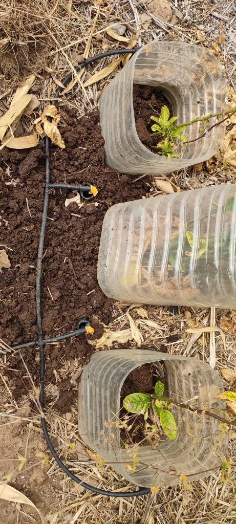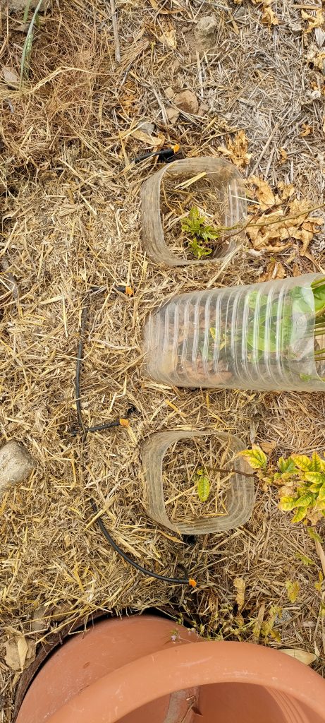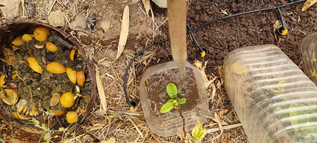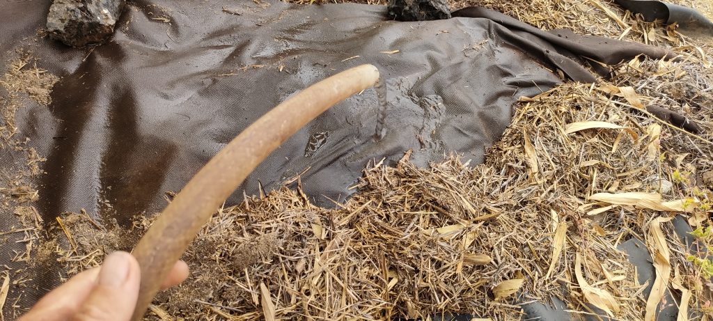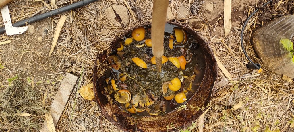 Der gute Nebeneffekt ist hier, dass die Maracujas eigentlich ein viel saureres Milieu bräuchten! Ich hab 8 statt 4,5 und kann daher erhebliche Mengen an Saurem dazu schütten! Der fermentierte Kompost wurde für die Würmer bereits etwas gespült und hier läuft nochmal Saures in die Tiefe, wo es sich in einer Art Unterschale aus Folie sammelt.