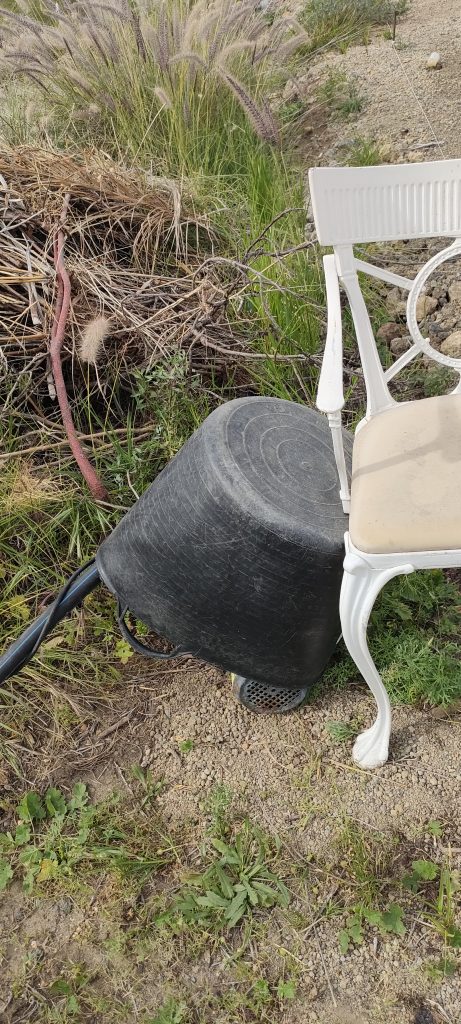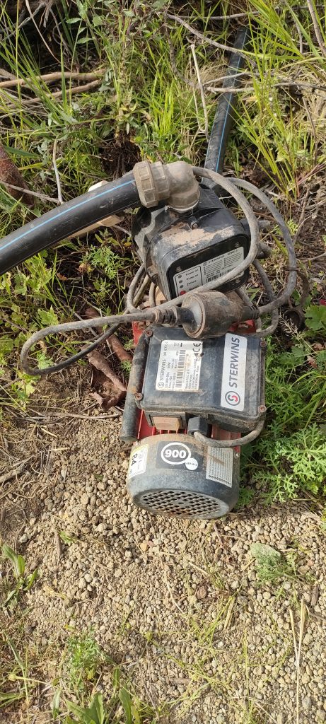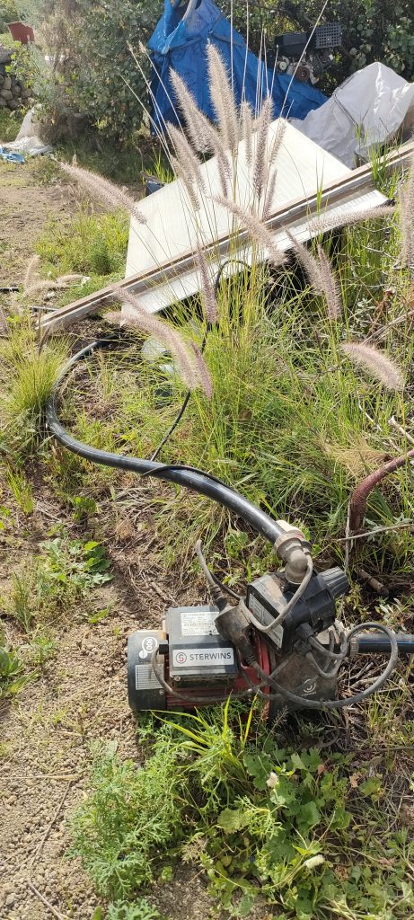 Die Leitung zur Warmwassertherme geht ca. 50m. länger und in der Therme hat der Heizschlauch nochmal 100m. Länge! Zudem ist er etwas dünner. Heute hab ich vor der Dusche kurz eine Pumpe dazwischen installiert, die ich in meinem ersten Grundstück gebraucht hatte, weil es da keinen Wasserturm,bzw. Hang gab.