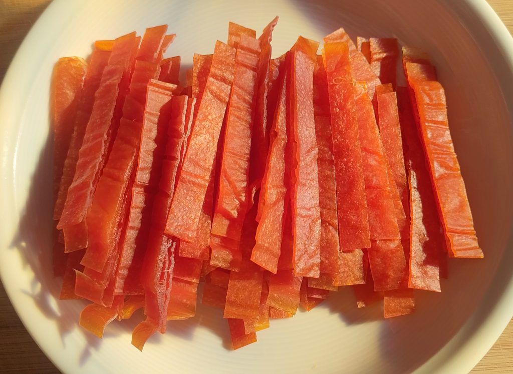 Dreierlei saure Schnitten: Papaya & Maracuja, Papaya & Zitrone und hier liegen süße Manga & Papaya Streifen. 😋