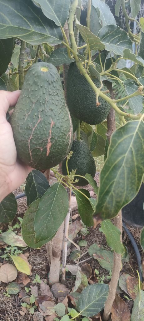 Die erste meiner drei fetten Avocados fiel vom Baum. Eine Papaya, Maracujas und dann bekam ich noch eine Regenpause, um einen frischen Salat zu ernten.