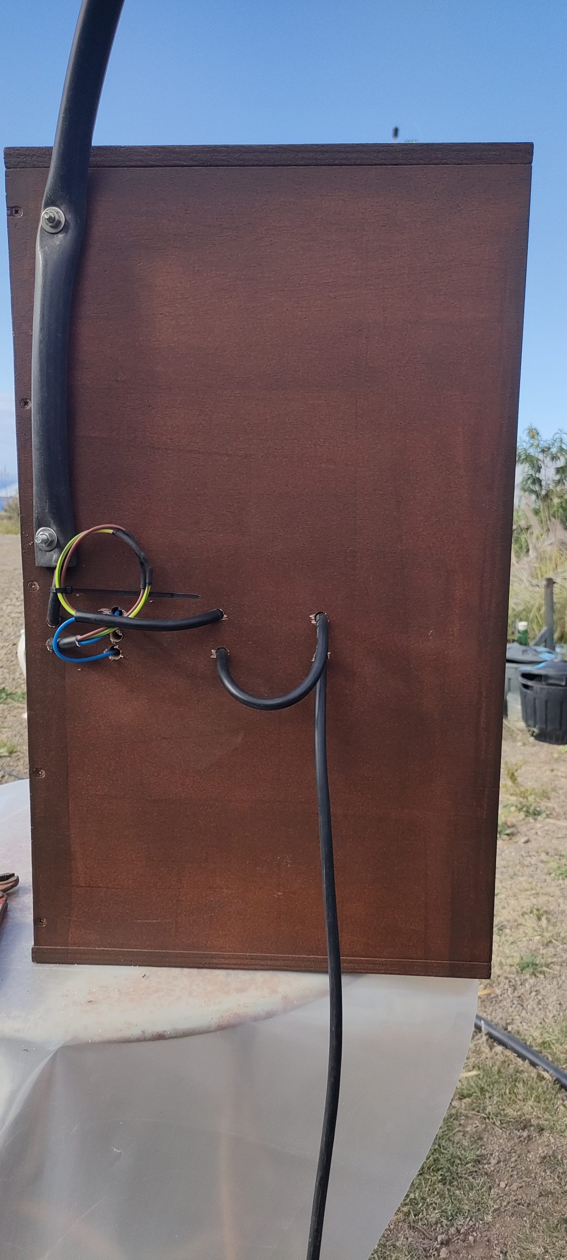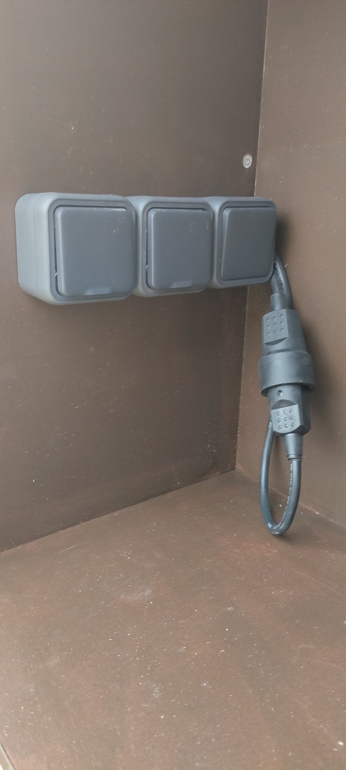 Da sind jetzt nochmal zwei Steckdosen und ein Schalter. Der Schalter schält die Kabelpeitsche, die ich in letzter Minute einer Steckdose vorzog. Dort kann ich für einen Lüfter, Teile wie Thermostat, Zeitschaltuhr und, oder Geschwindigkeitsregler, den ich schon habe, dazwischen klemmen. Letzterer ist schon so unförmig, dass er benachbarte Steckdosen behindern würde und mit der Kabelpeitsche bin ich total flexibel, egal was kommt!
