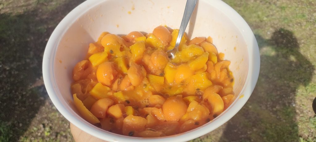 Gestern bereitete ich mir selber ein Verwöhnprogramm, mit Fruchtsalat, grünem Salat und Spätzle aus frischen Eiern. 😋