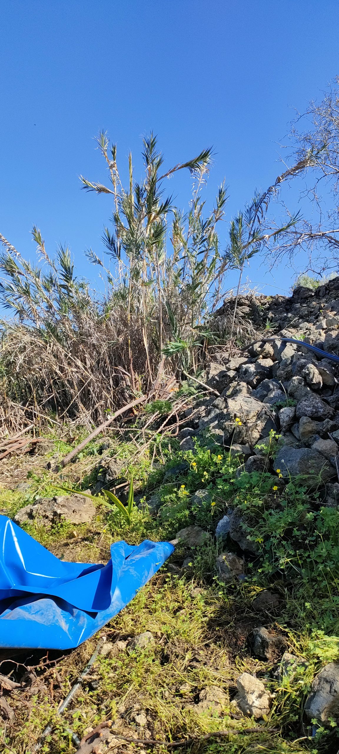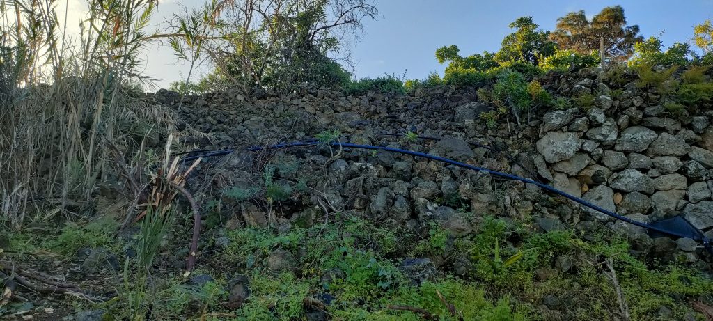 Der zuletzt gefällte Baum, verdeckte die letzte, eingestürzte Mauer. Hinter dem Bambus, links, steht die alte Mauer genauso schön wie rechts.