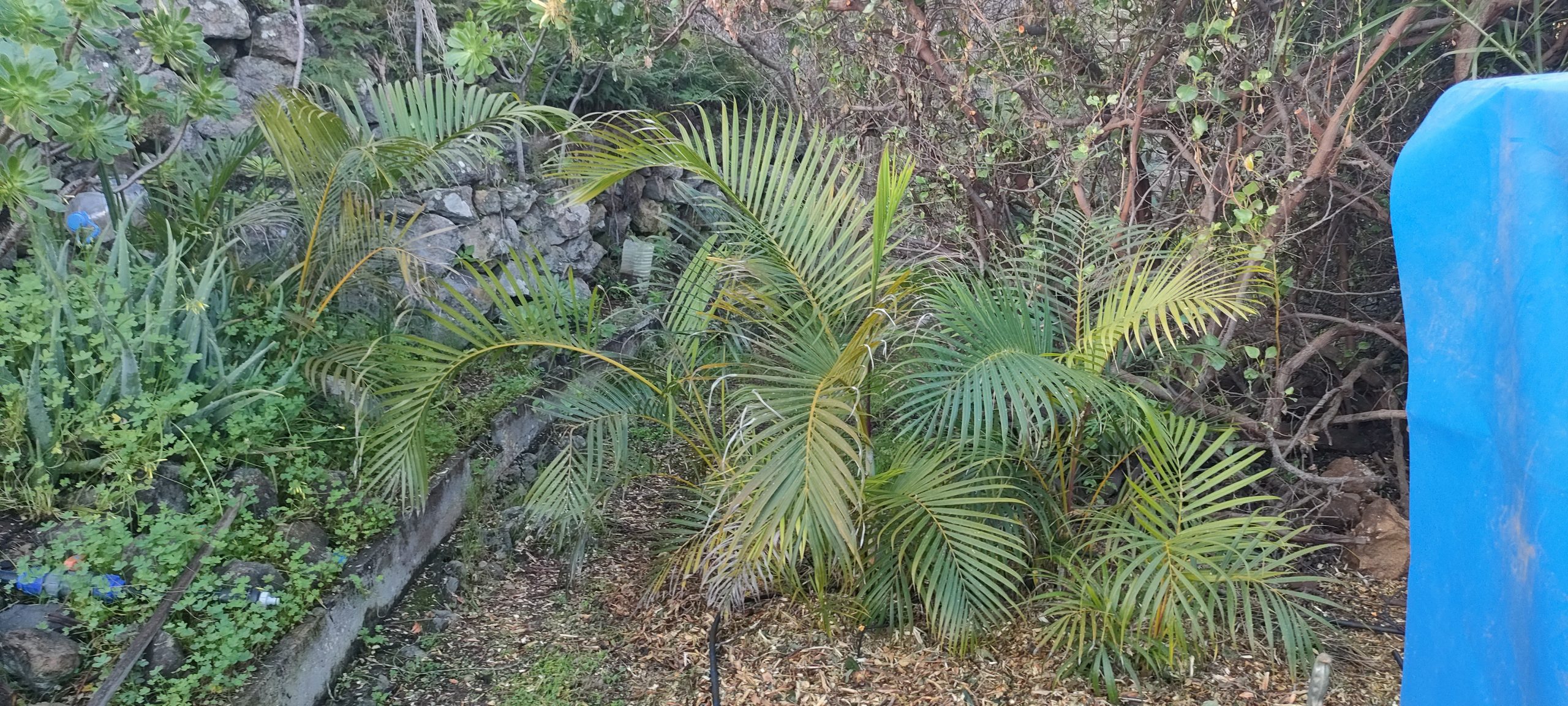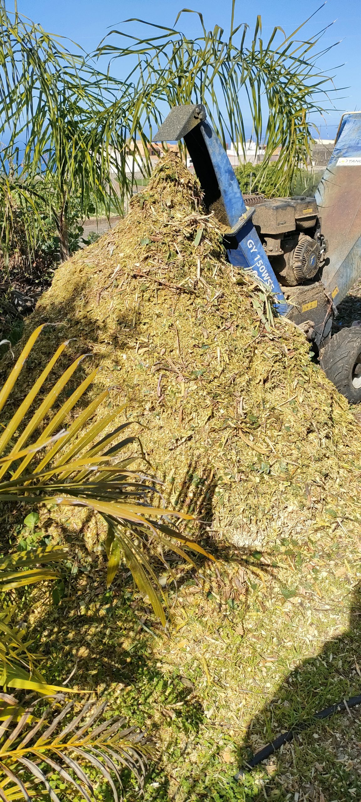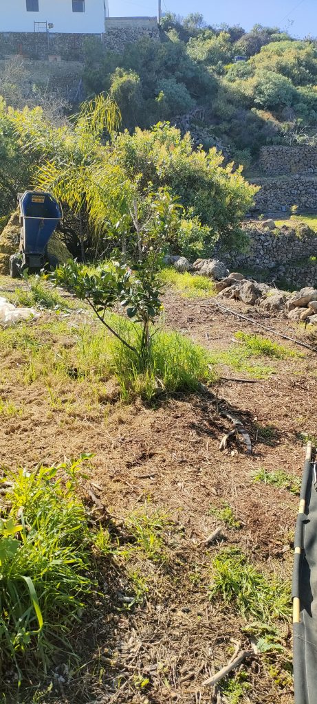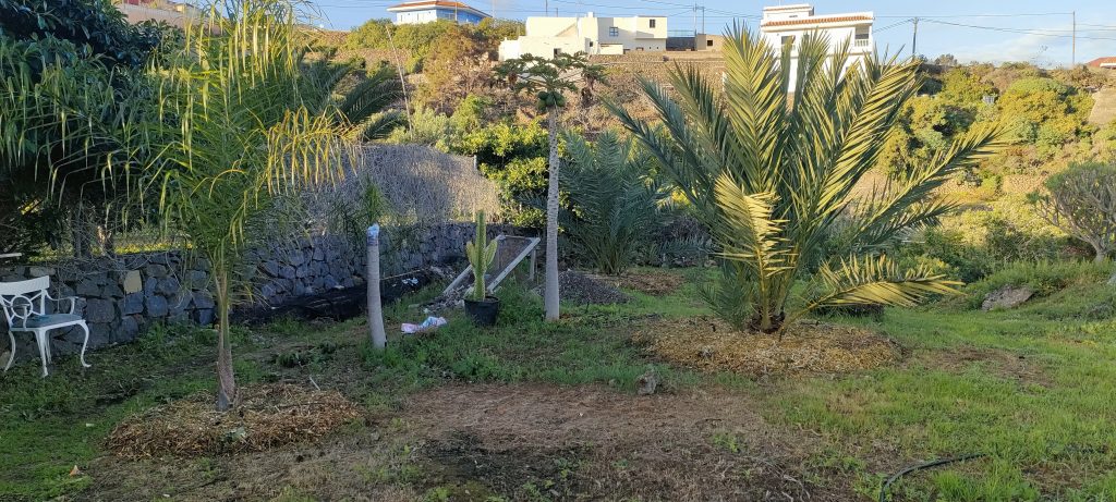 Gleich neben dem Häcksler, mulchte ich noch weitere Palmen, wo man wegen der vielen Tropfschläuche, kaum Mähen konnte.