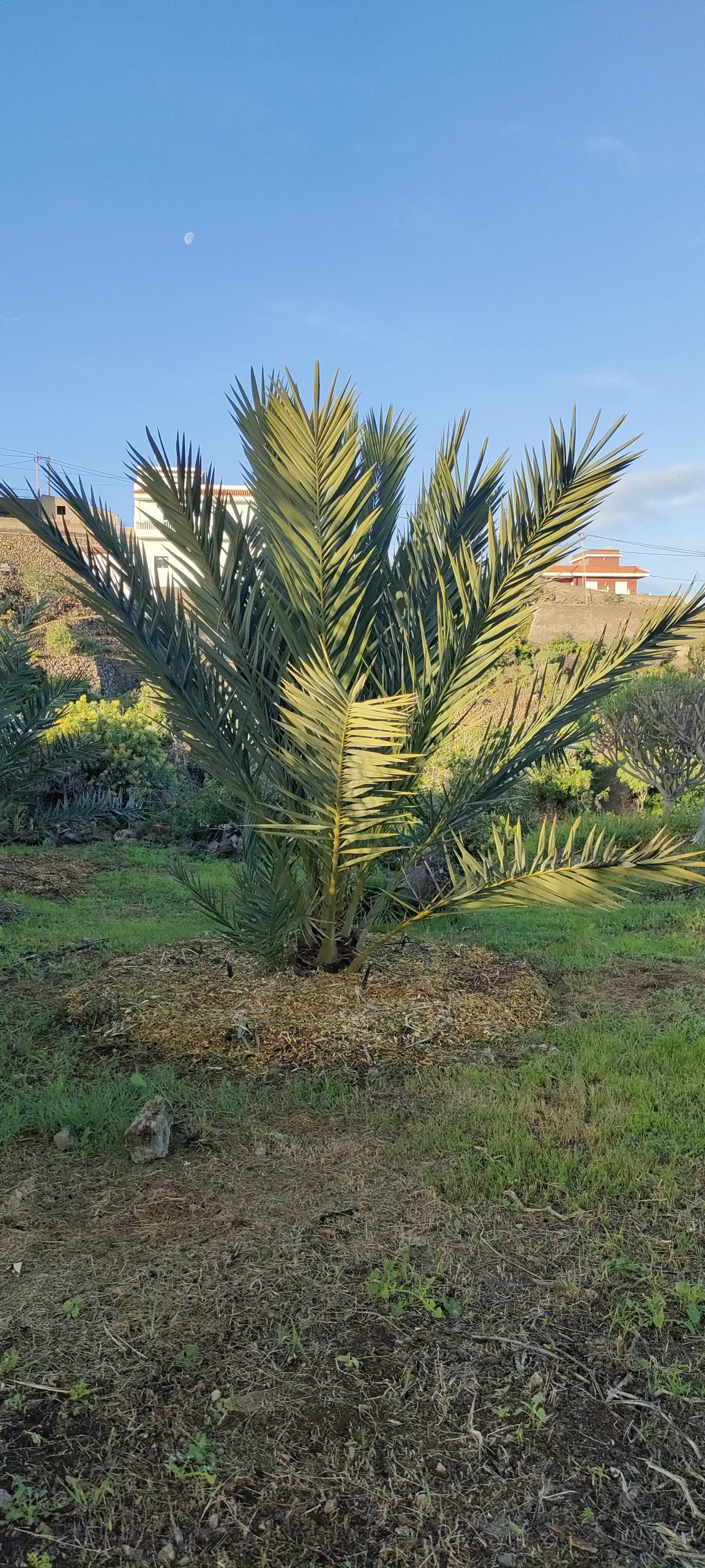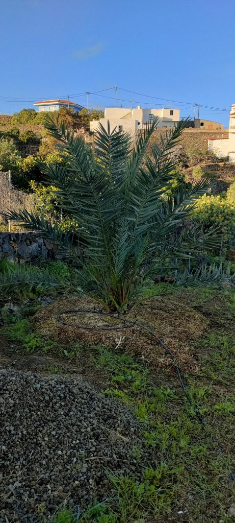 Unkraut abscheren, Würmer und Ökodünger. Ein Zentner Mulch wird pro Dattelpalme nicht reichen.