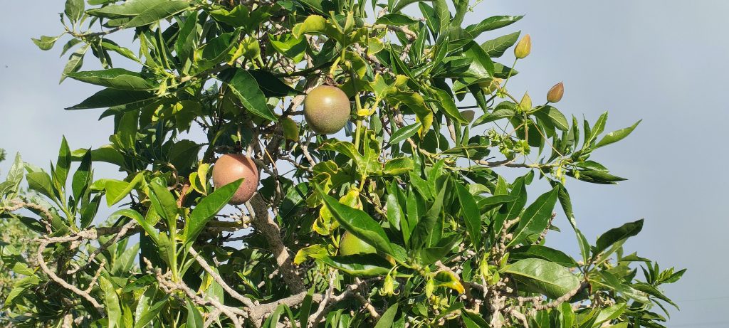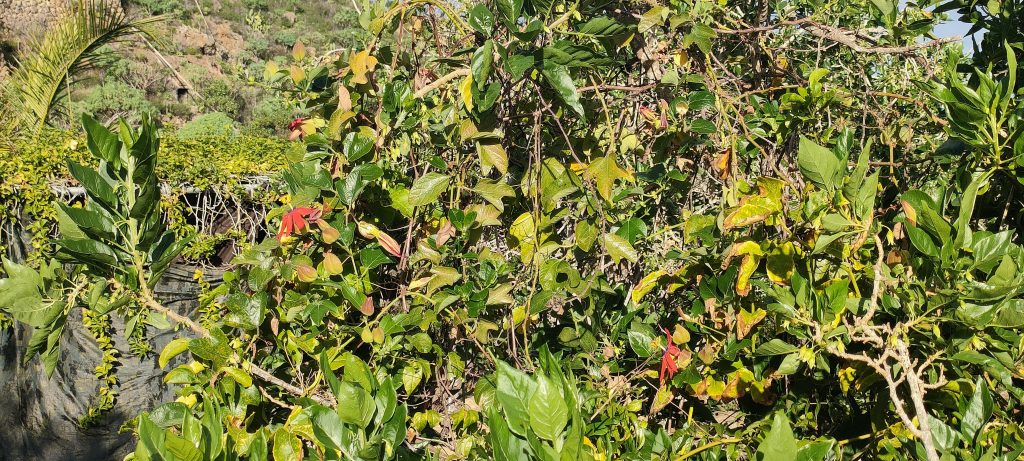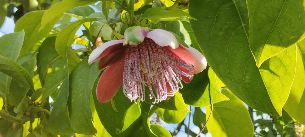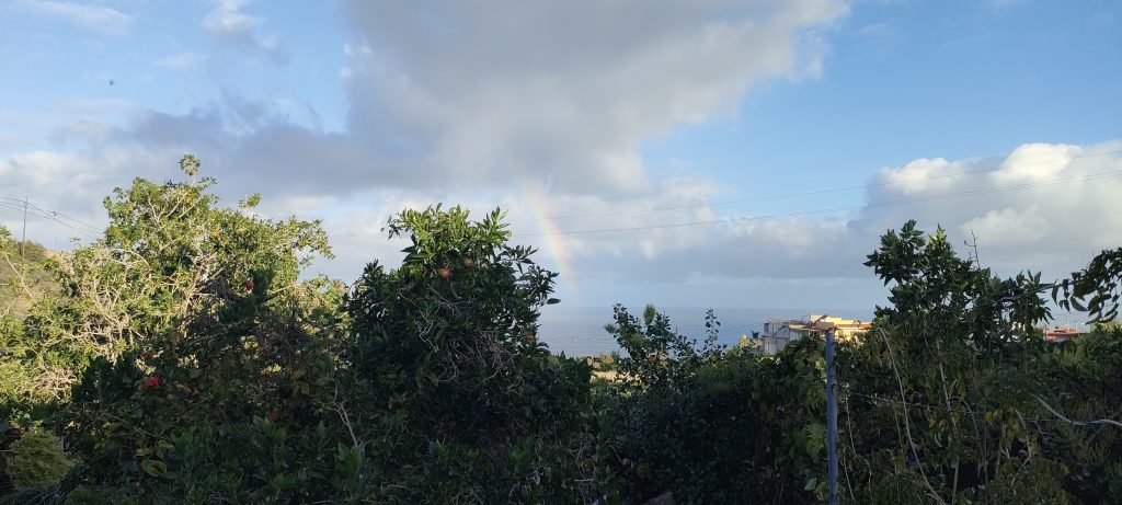 Blick über die Brücke: Bin ich nicht gesegnet? Maracujas, Paradiesblumen, Natur und ein Regenbogen.