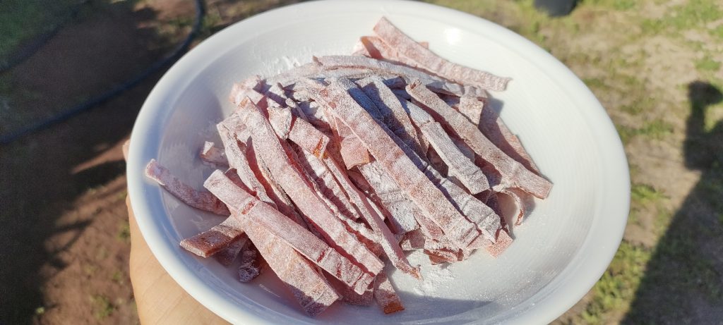 Die letzten Fruchtgummis pudere ich als Trennmittel mit Puderzucker. Da rieselt noch einiges ab und dann gefällt mir das Ergebnis ganz gut.