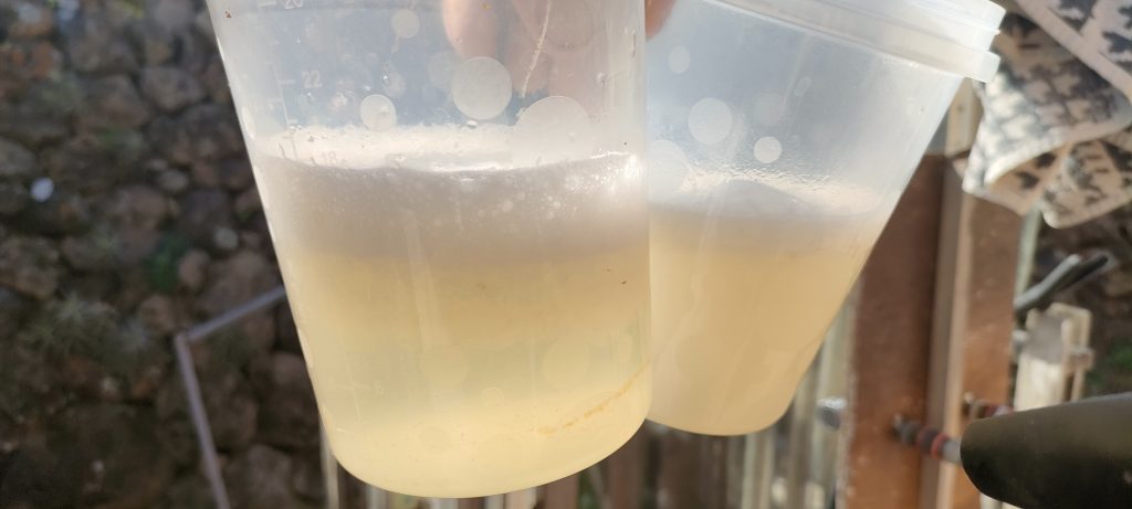 Links, Aloe Vera mit Natron und die zweite Spülung rechts: Aloe mit Kokosöl und Mikroorganismen.