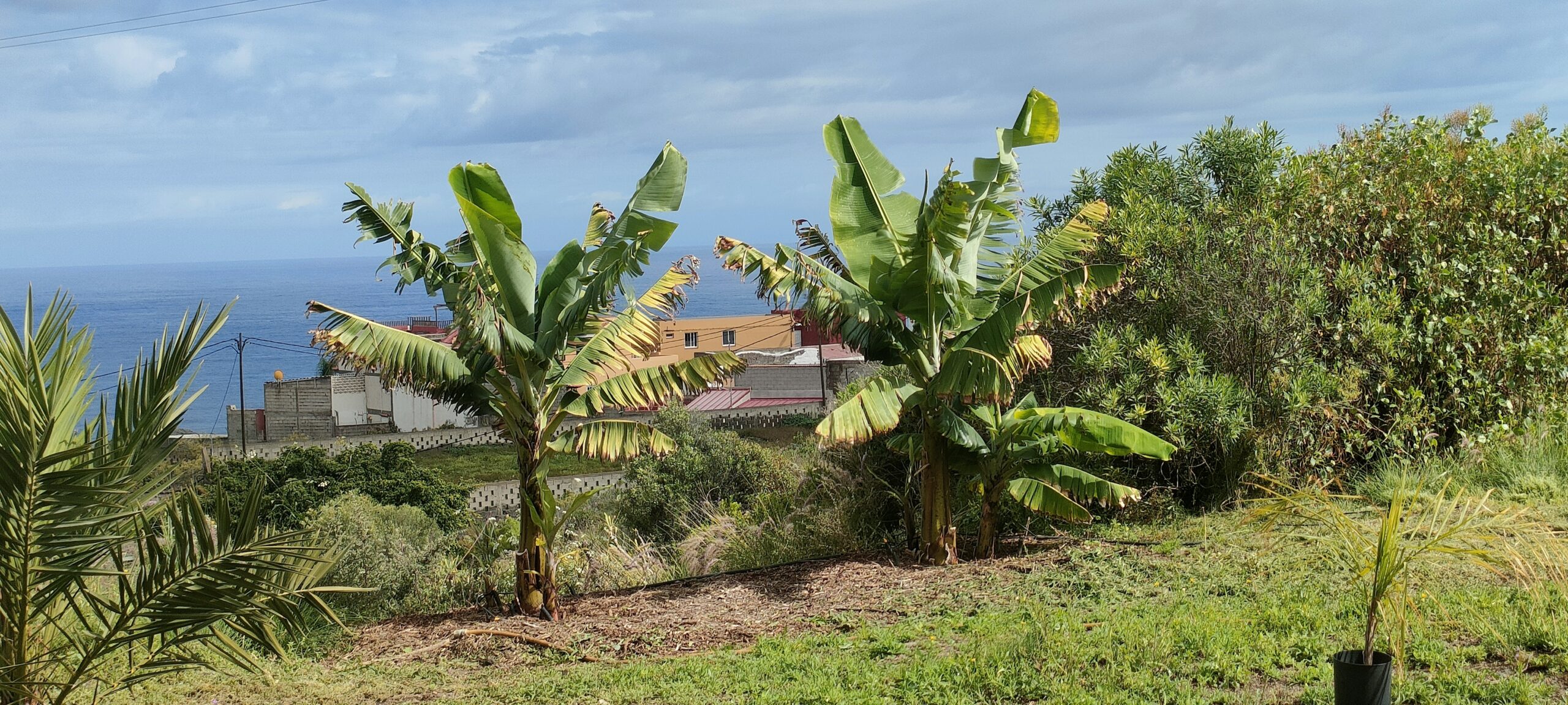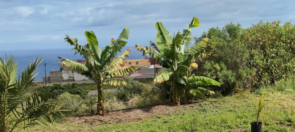 Dass hier bereits die ersten vier Coco Palmen wachsen. Hinter dem Busch sieht man rechts, Teile der Bananen und der Dattelpalmen.