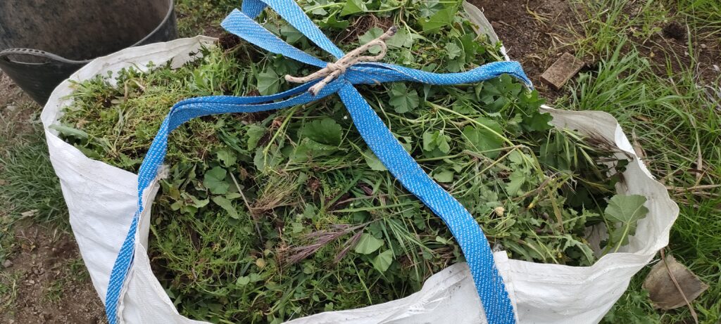 Es geht vor allem, wie ich ihn nenne, den Stachelspinat. An manchen Stellen, wo viele Kleine keimen, sind immer noch so viele fiese Stacheln, dass sie in meinem Kniepolster stecken bleiben! Sollte es je aufhören zu regnen und das gröbste Kraut weg ist, werde ich diese Stellen mit dem Besen abtragen.
